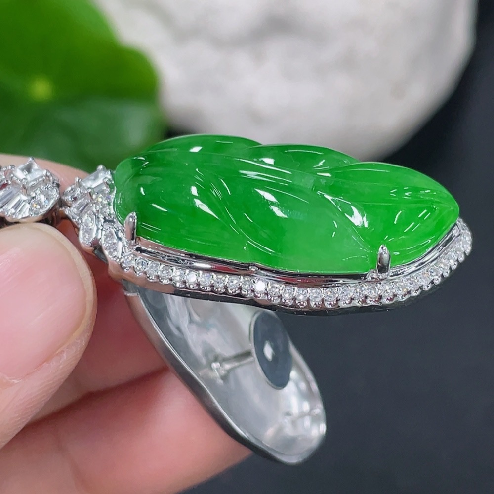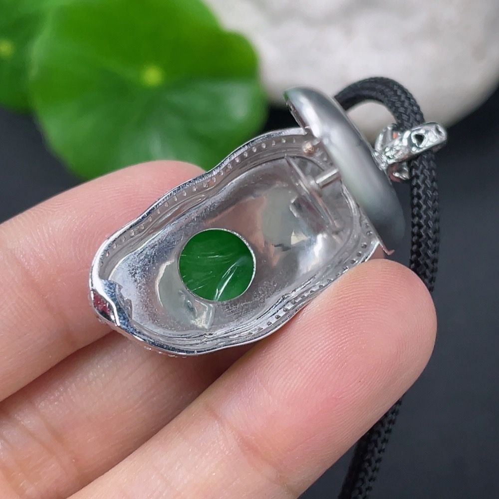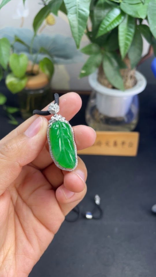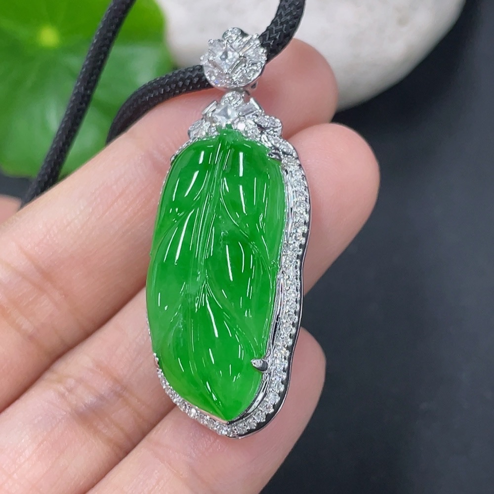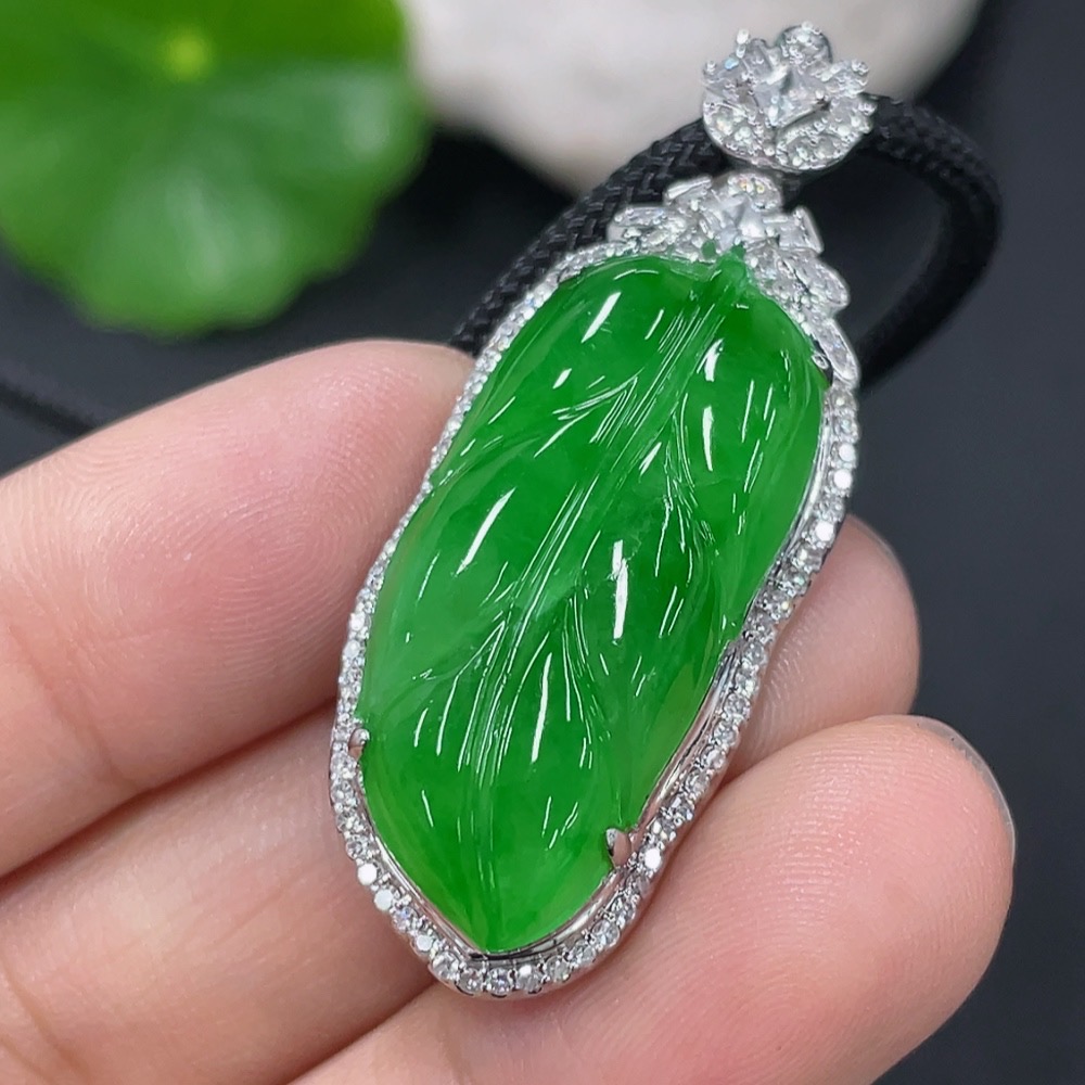 Jadeite inlaid leaf pendant, pendant 18k, the rest non-gold, diamond accents only on the main body (main body non-diamond quantity large 2 pieces small 2 pieces) total weight approx. including rope 15.6g