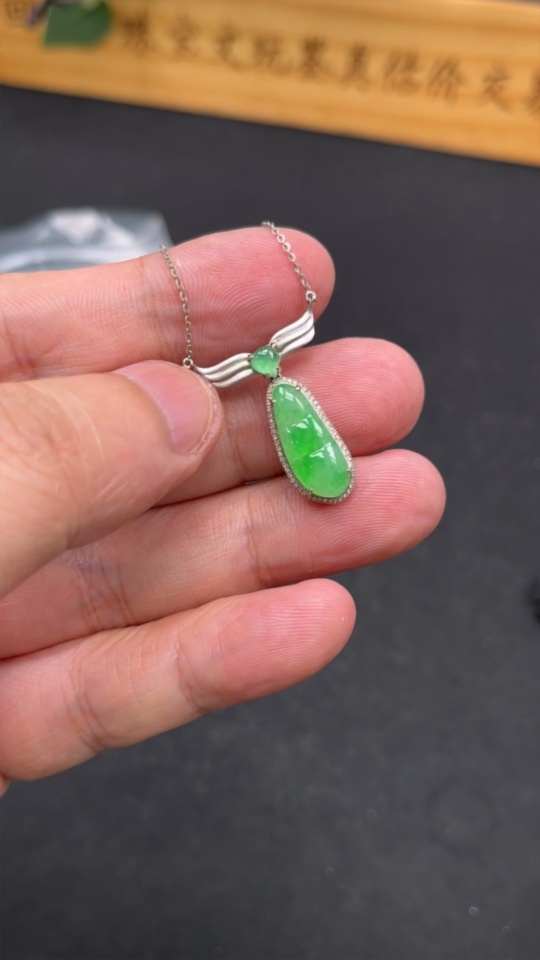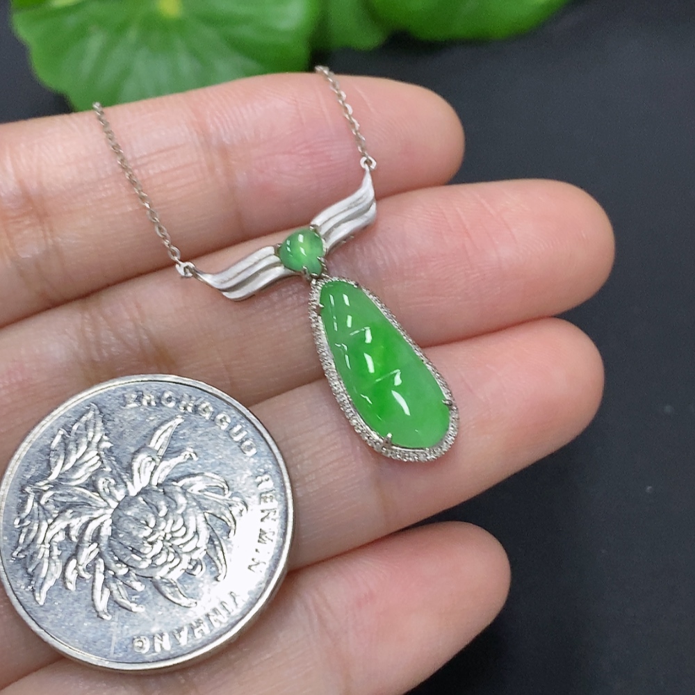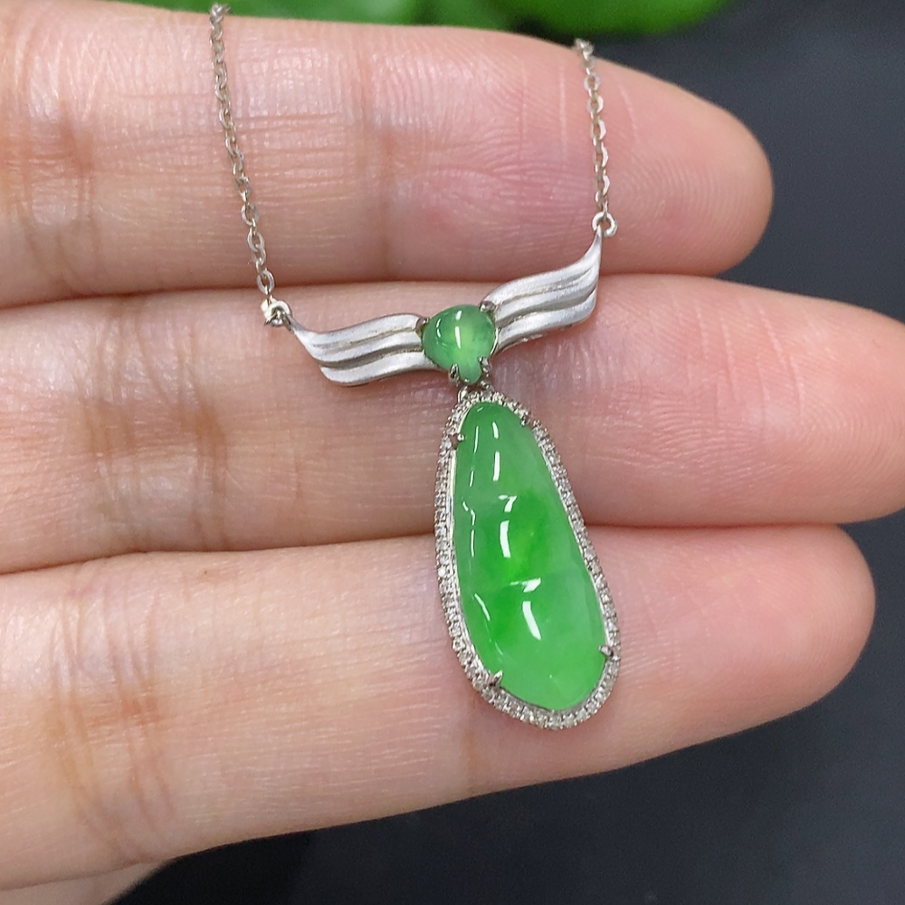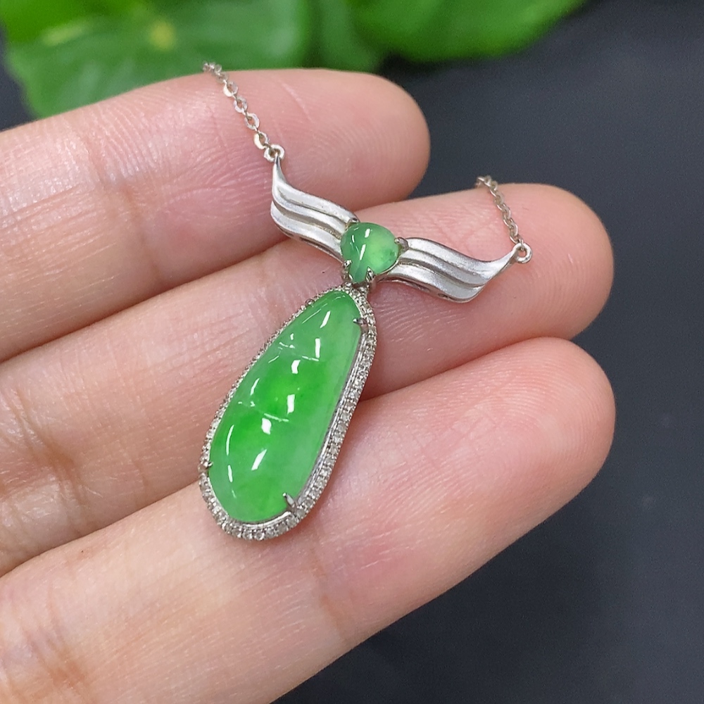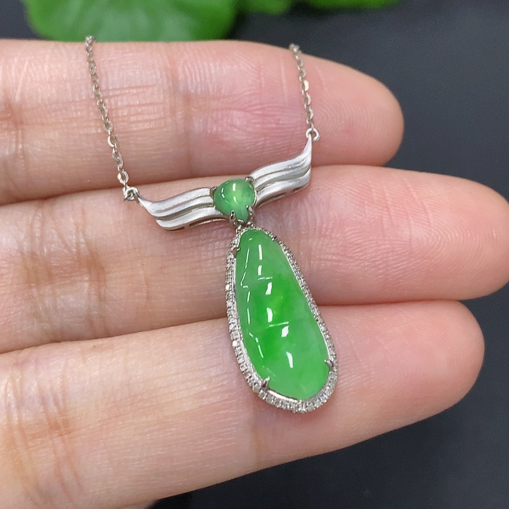Jadeite Lucky Bean Pendant with 18K Gold and Diamond Accents, Total Weight Approximately 2.7g Including Chain