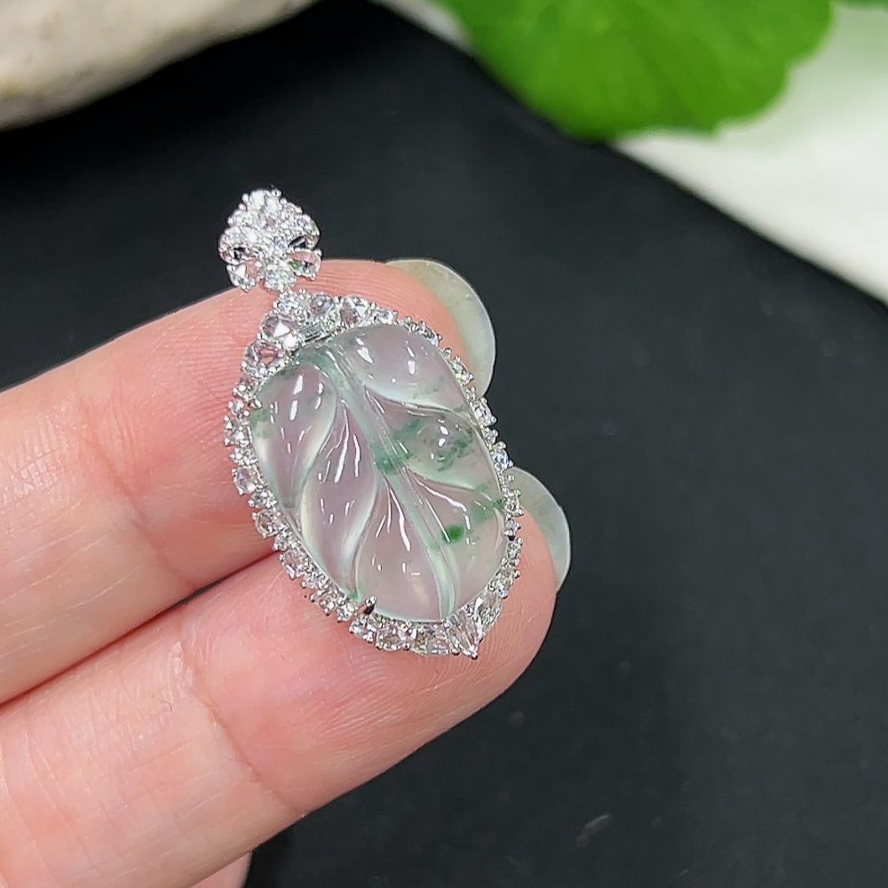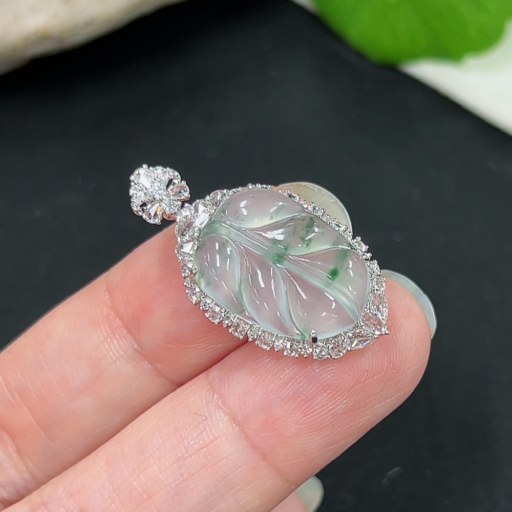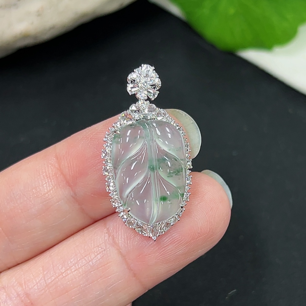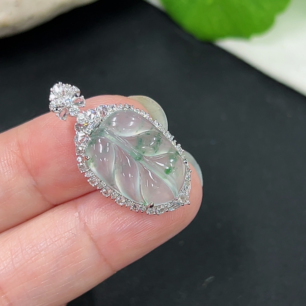 Jadeite Pendant Leaf 18k Gold Inlaid with Diamonds Total Weight Approx. 2.86g