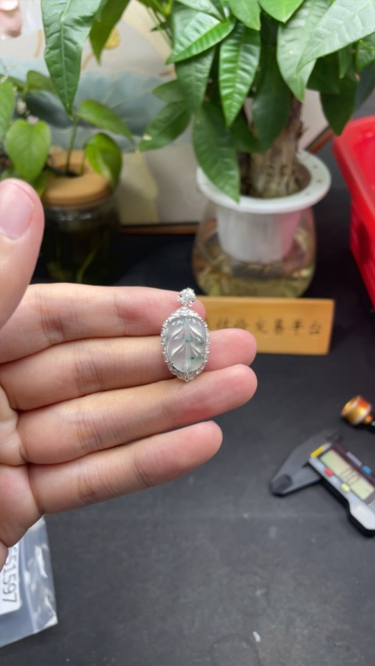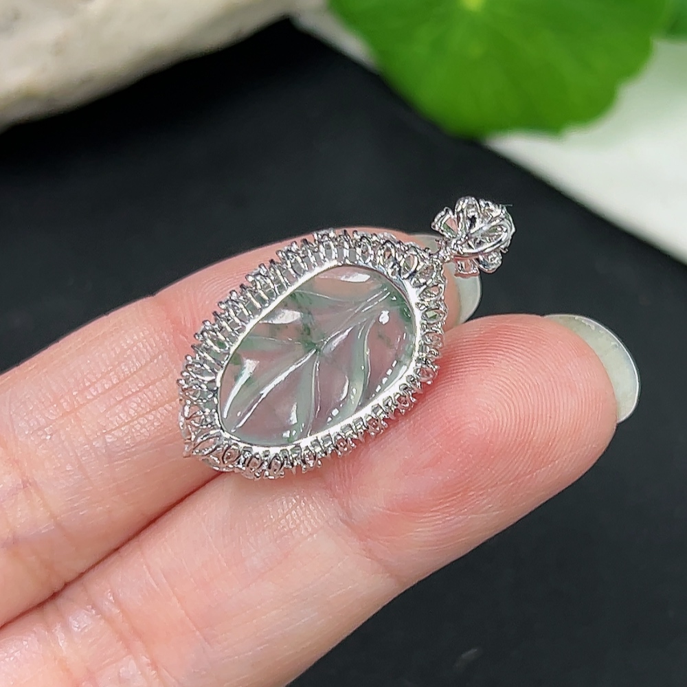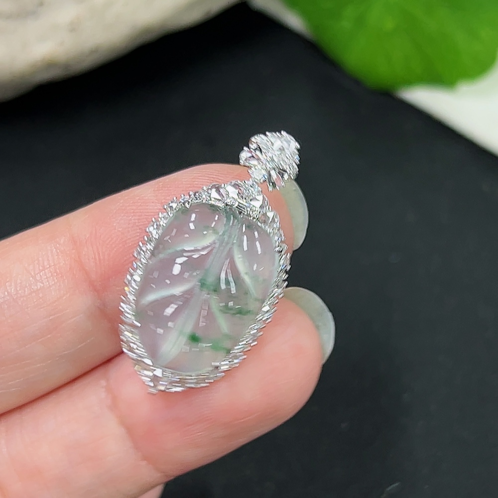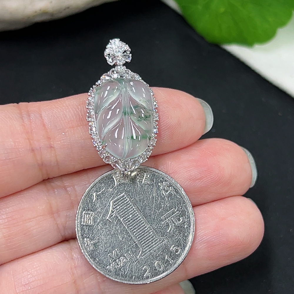 Jadeite Pendant Leaf 18k Gold Inlaid with Diamonds Total Weight Approx. 2.86g