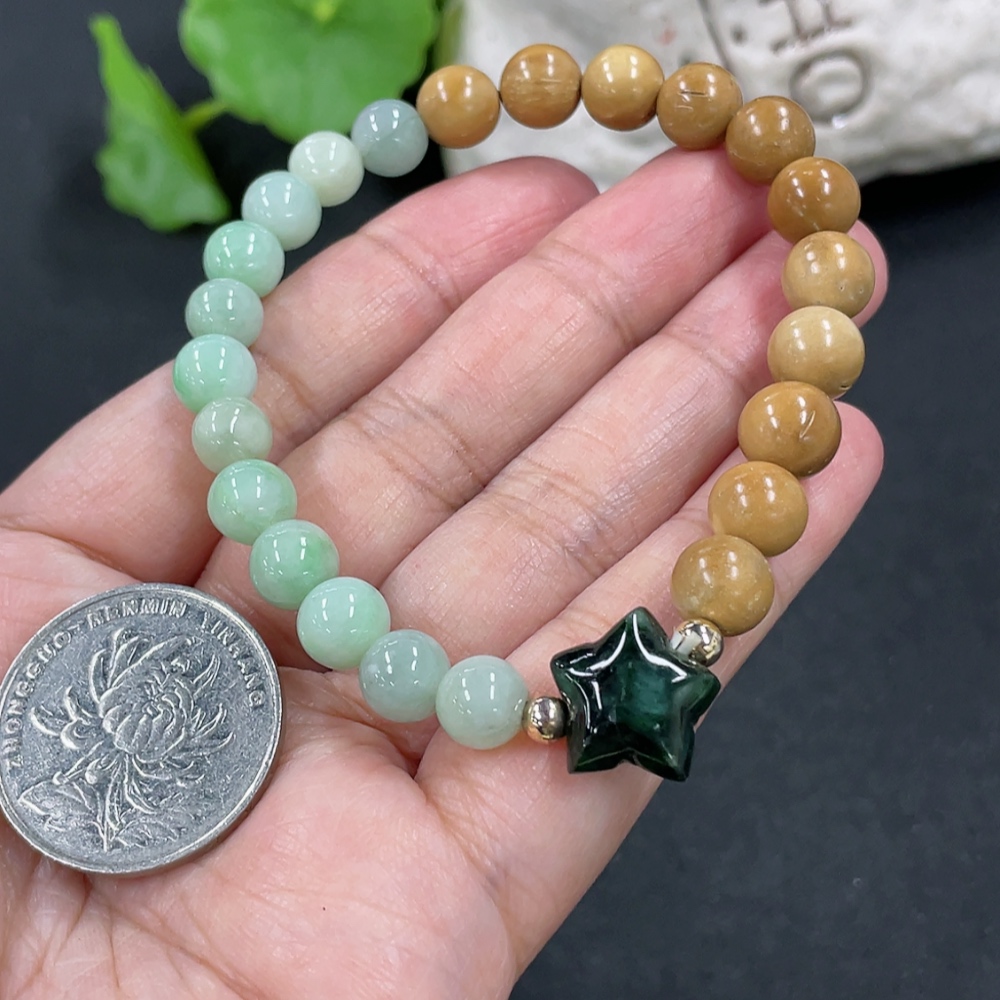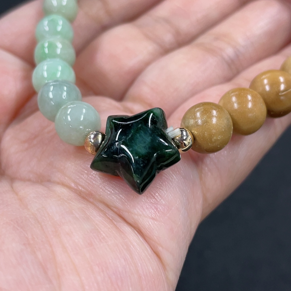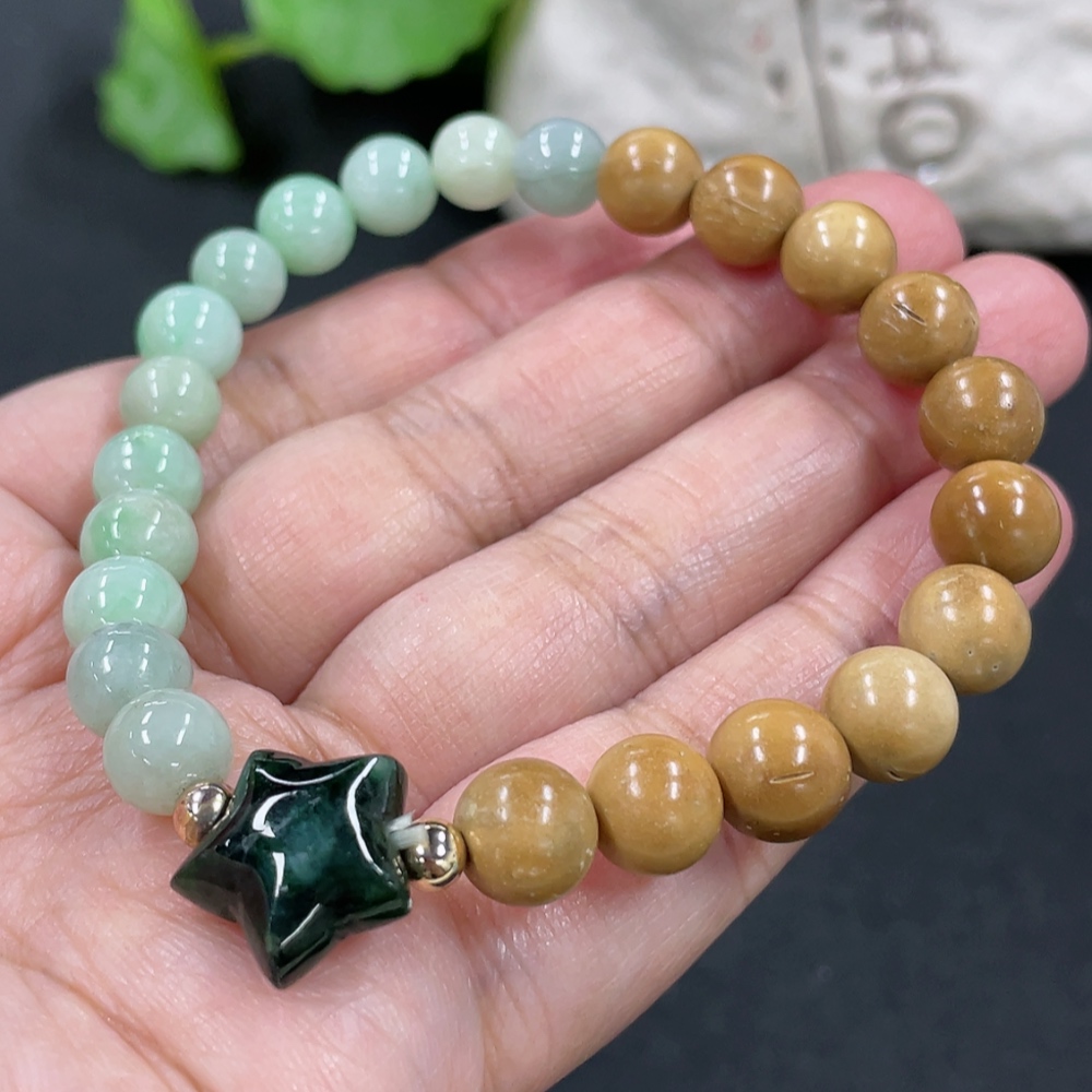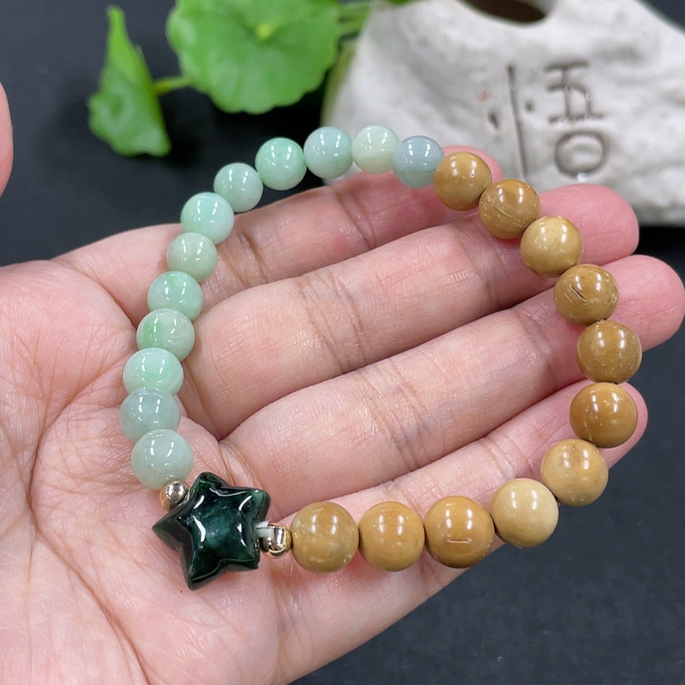 Jadeite and Wood Bead Bracelet, Approx. 7.4mm, Total Weight Approx. 14.5g, Contains Other Mineral Components, Non-Gold Matching Beads