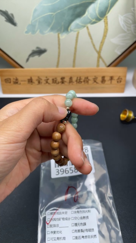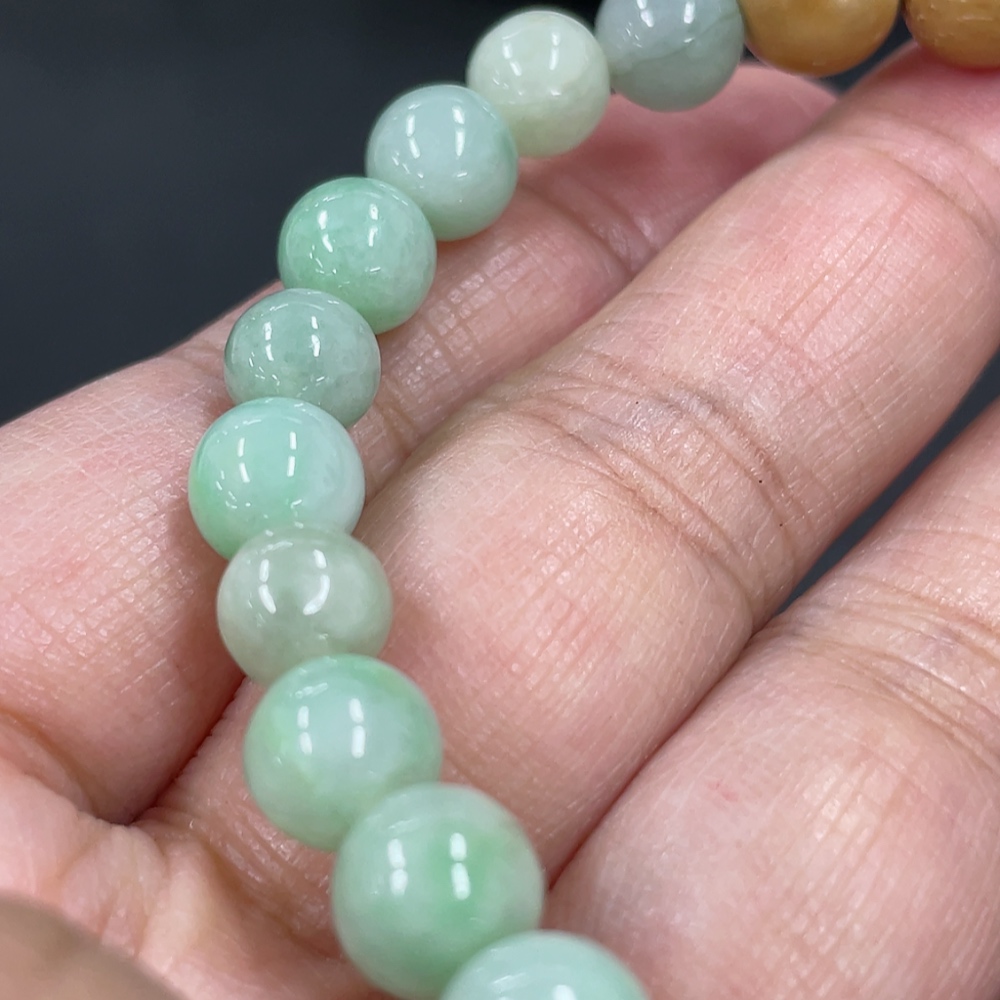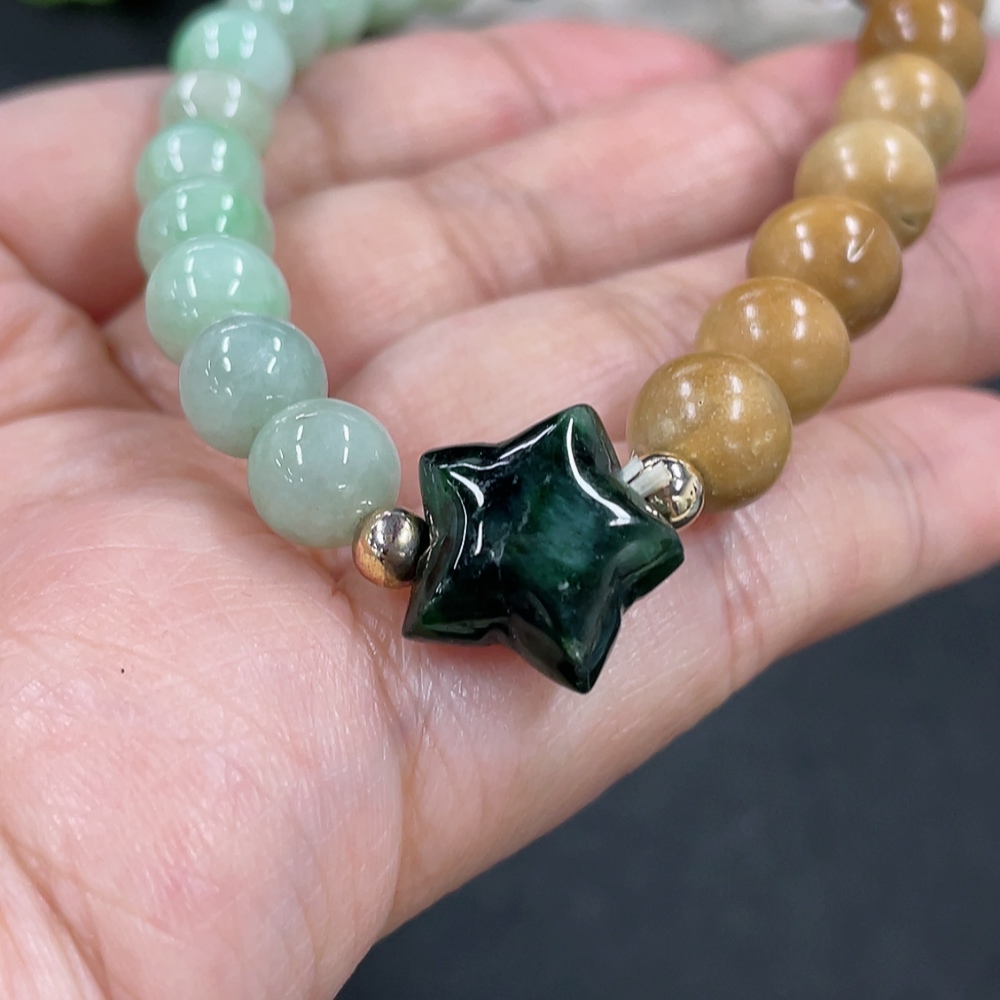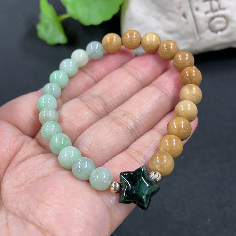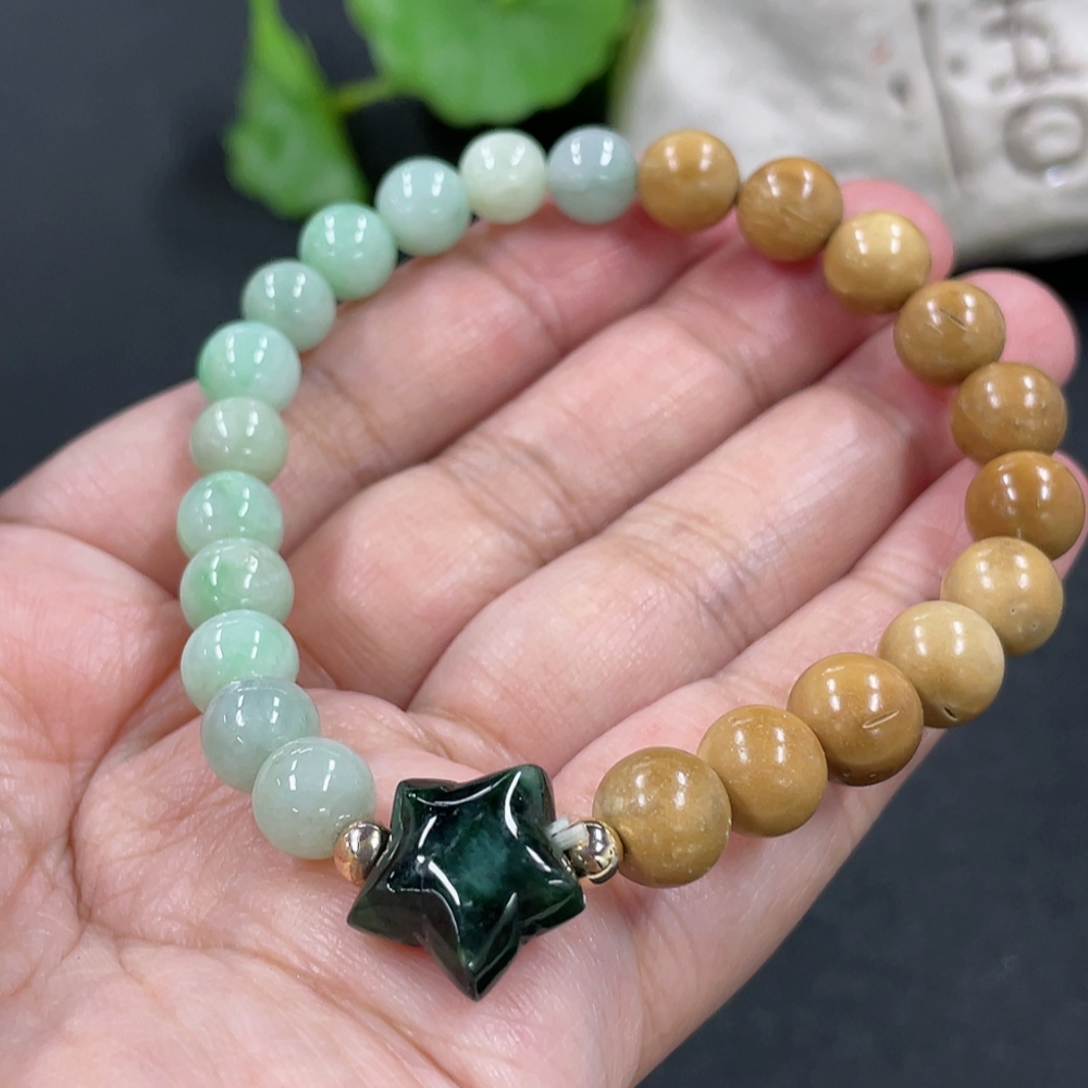 Jadeite and Wood Bead Bracelet, Approx. 7.4mm, Total Weight Approx. 14.5g, Contains Other Mineral Components, Non-Gold Matching Beads