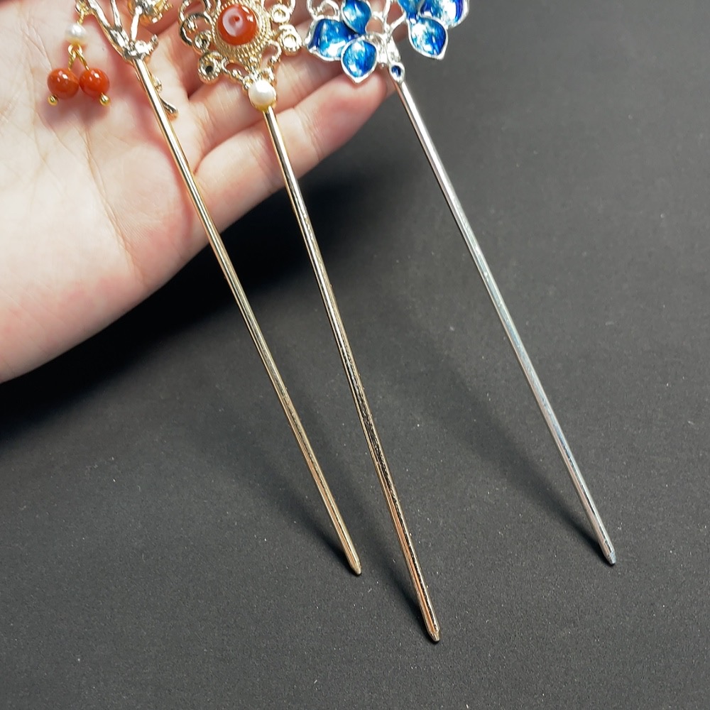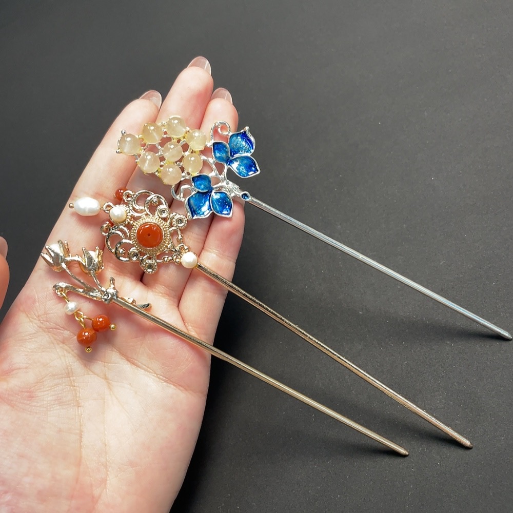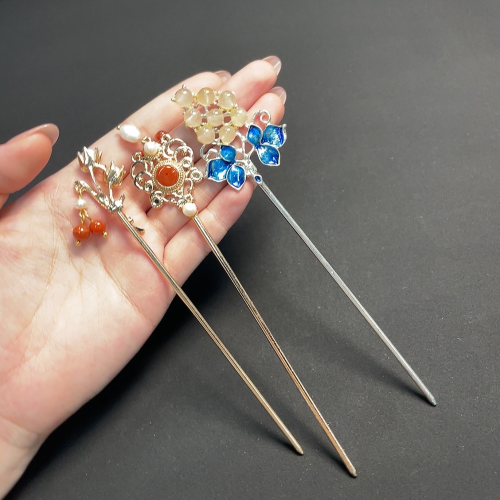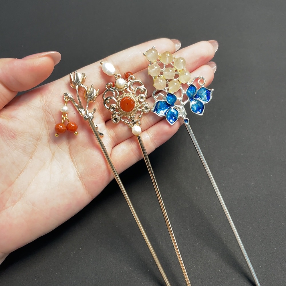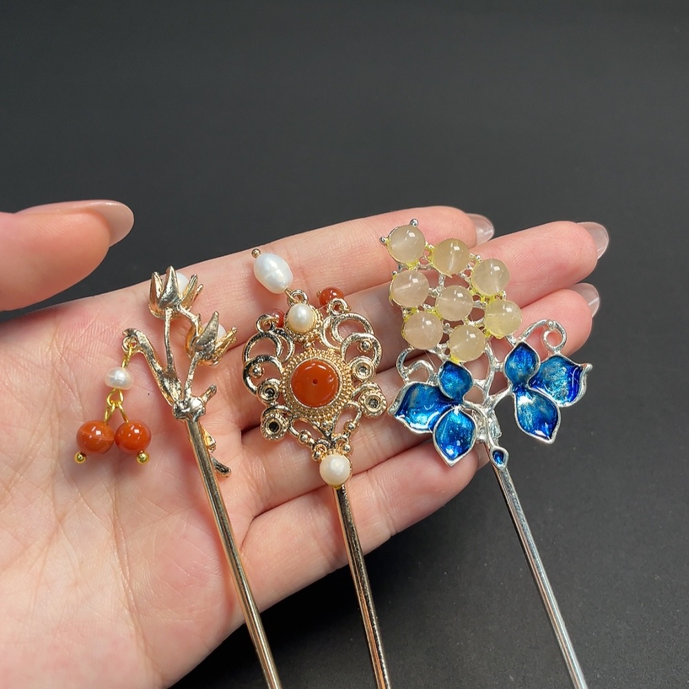 Red Agate Hairpin with Pearl and Crystal Inlays, Non-Gold Setting, Total Weight Approx. 37.48g