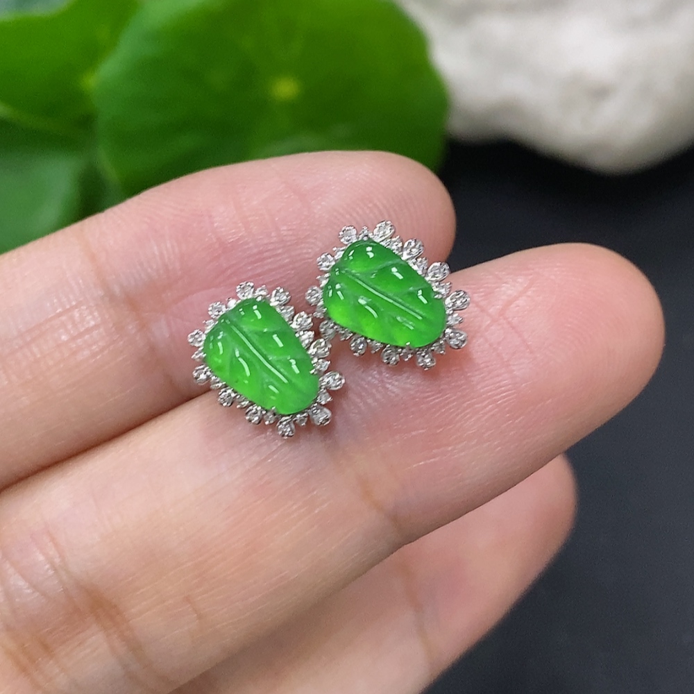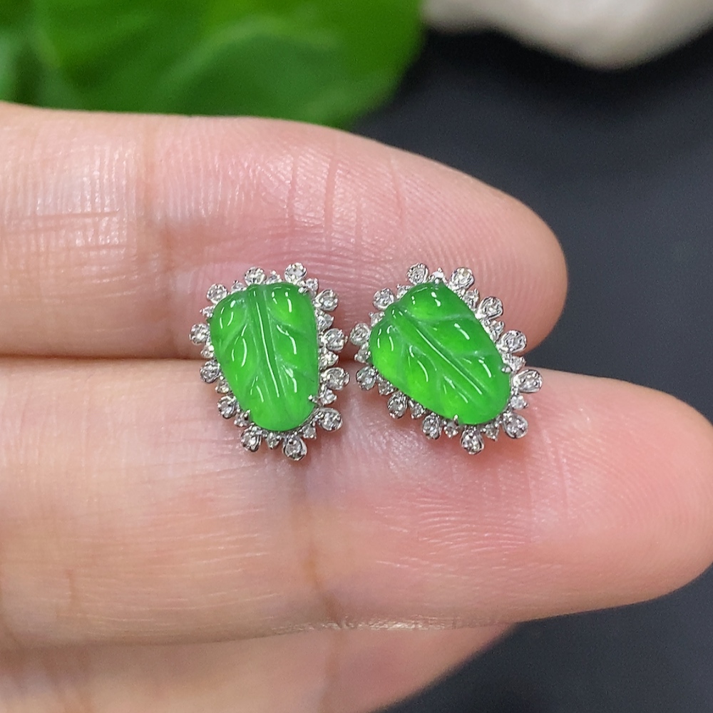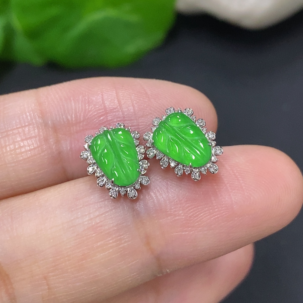 Jadeite Leaf Earrings 18K Gold Total Weight Approx.1.4g (With Diamond Accents)