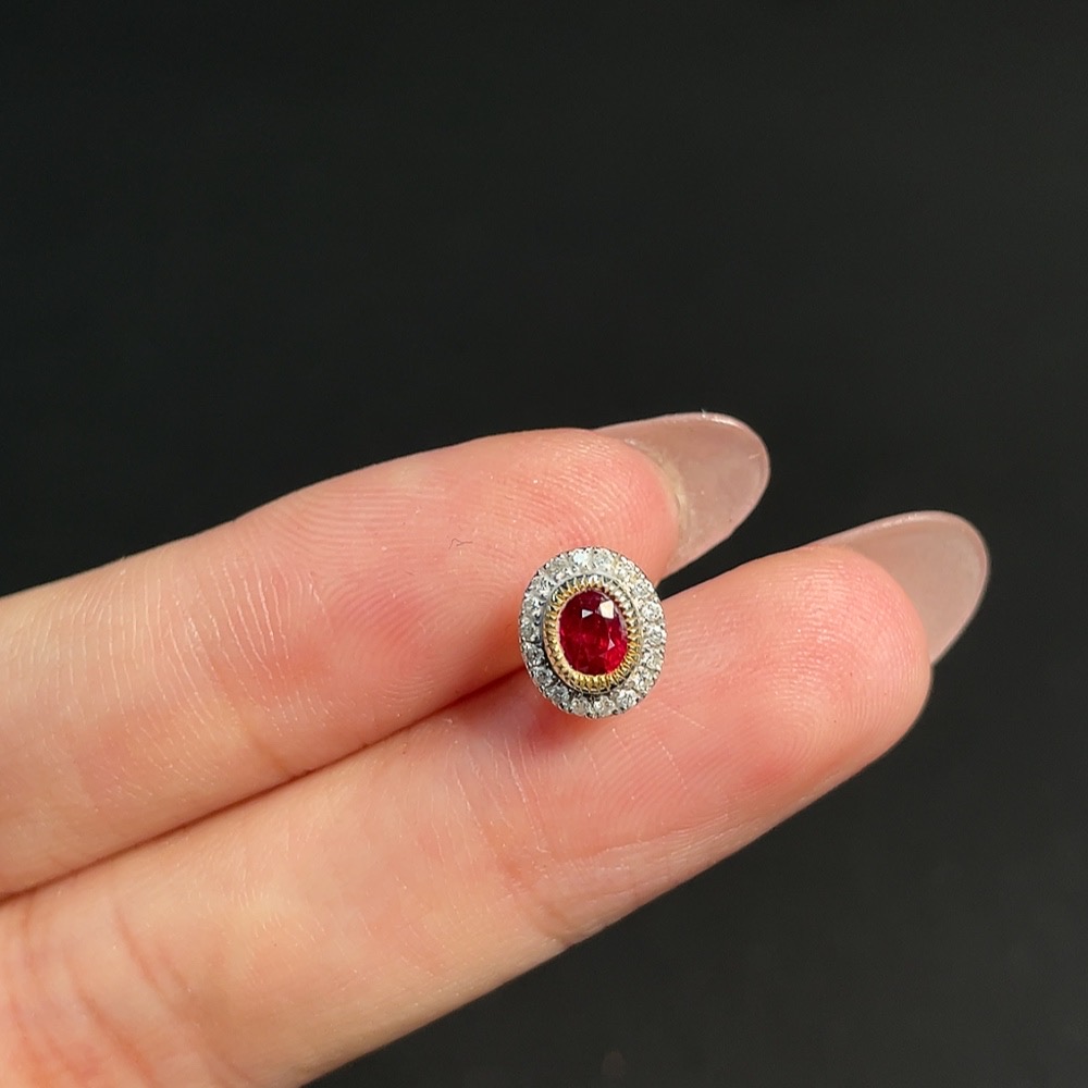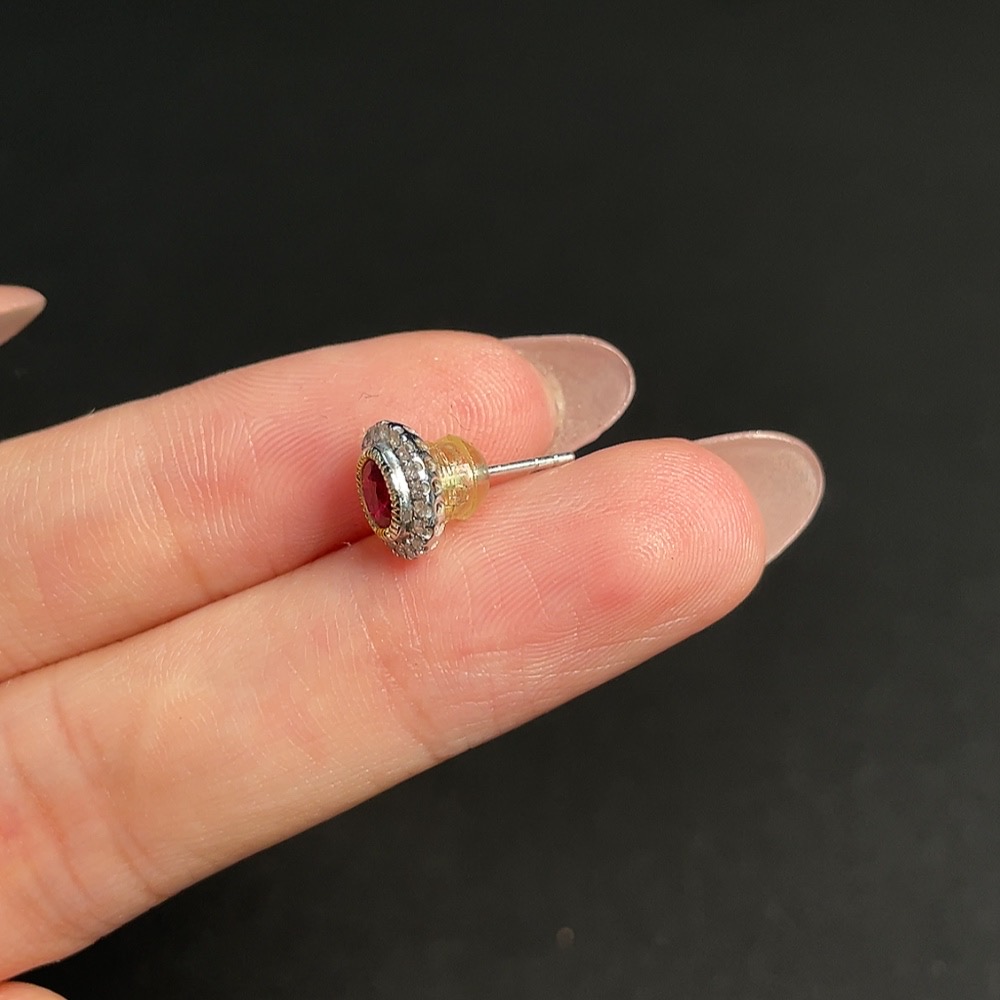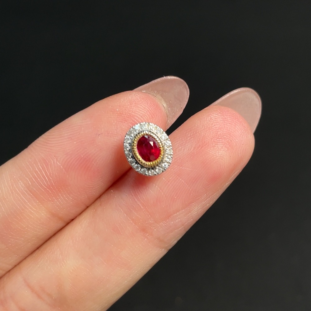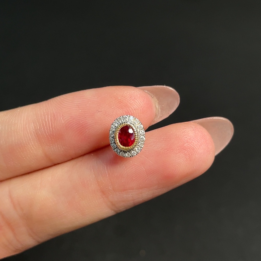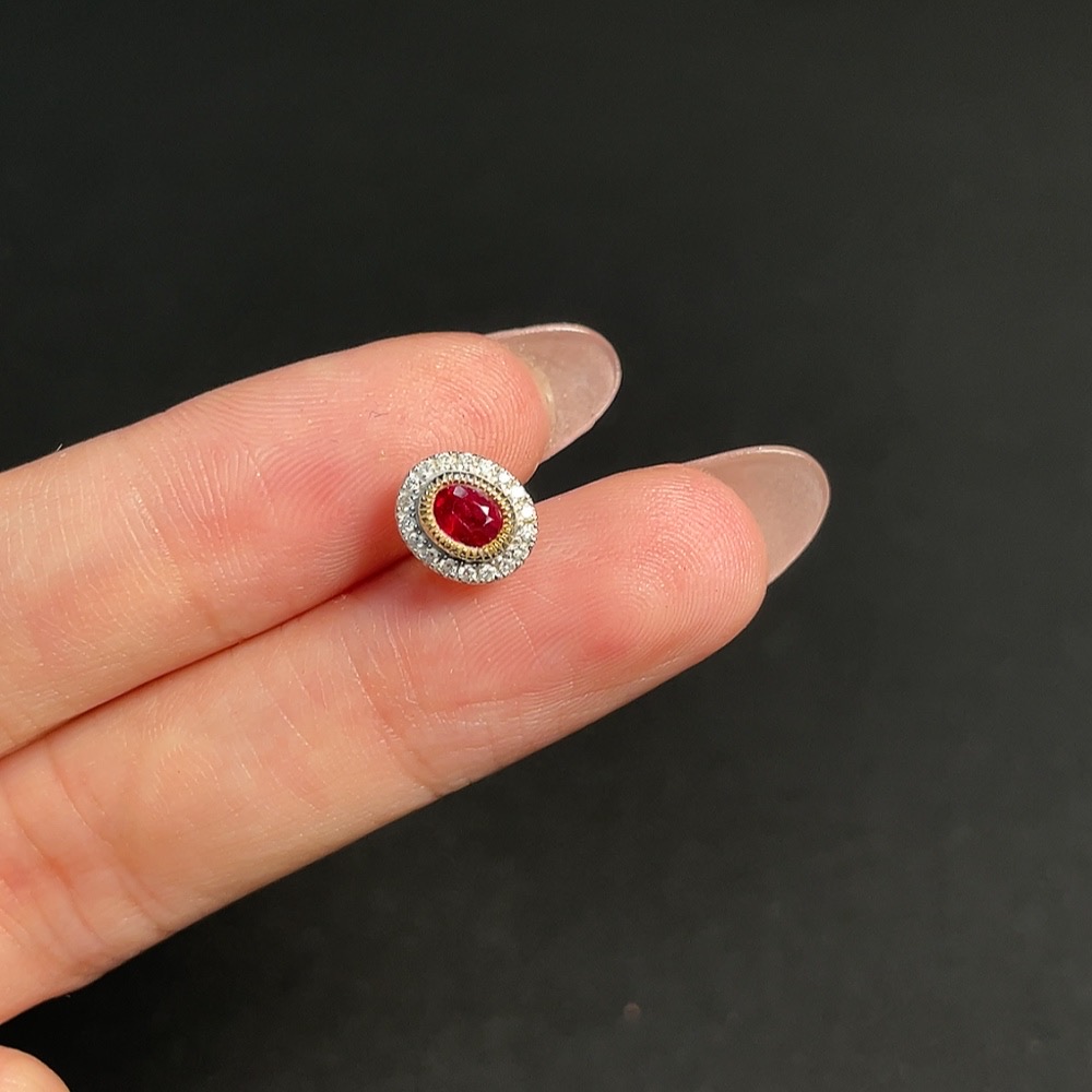 Ruby Stud Earring, Single Piece, 18K Gold, Total Weight Approx. 0.63g, Accented with Diamonds
