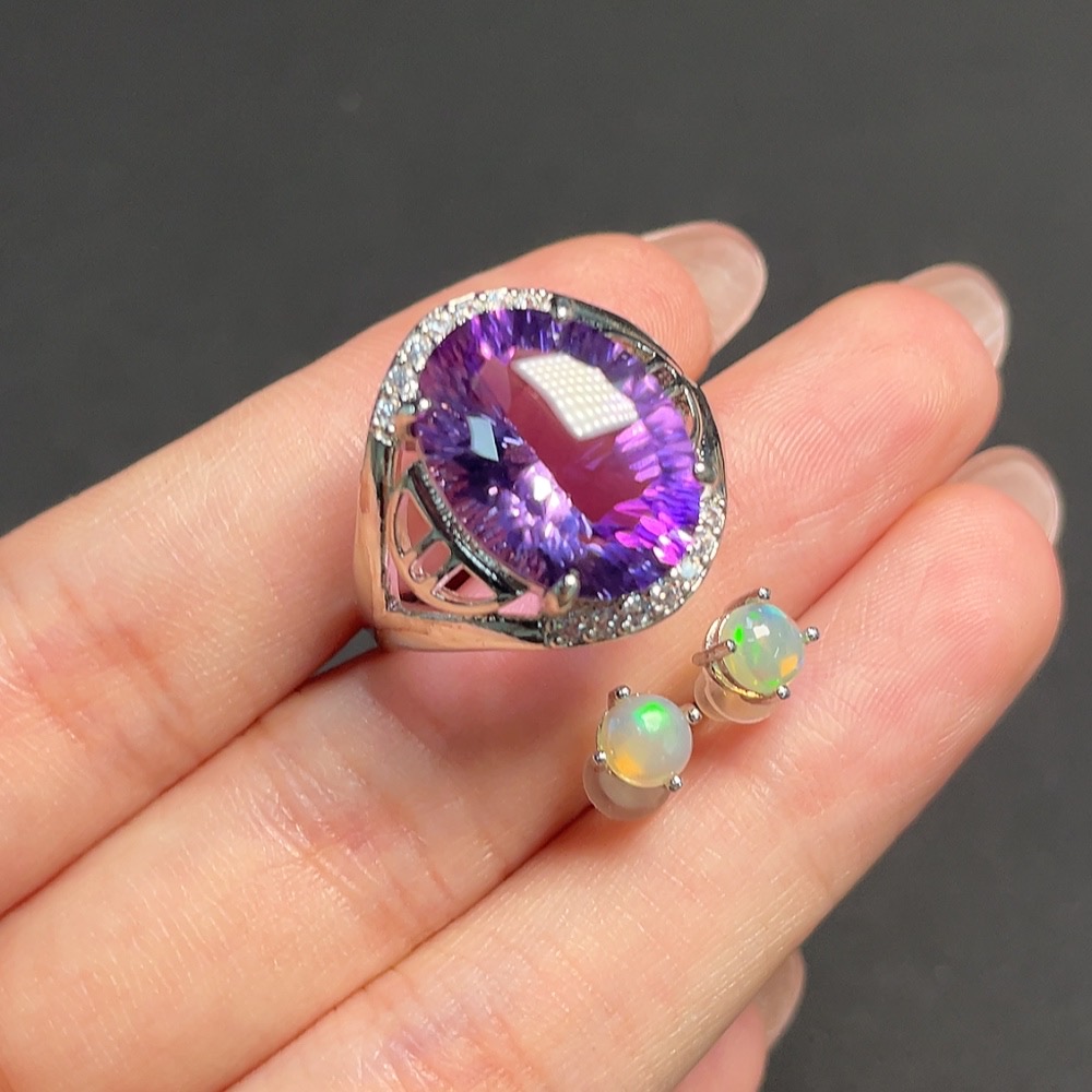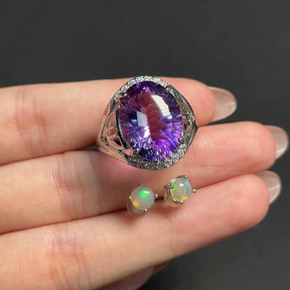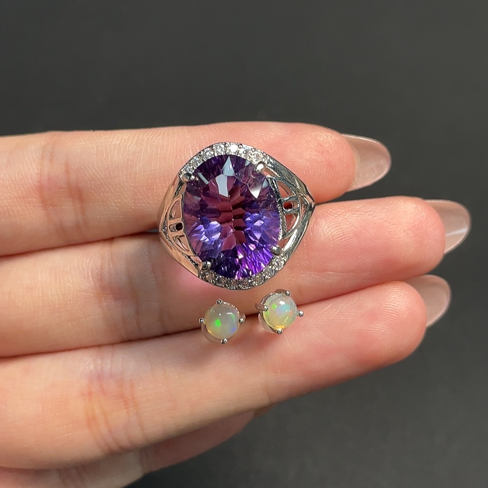 Crystal and Opal Inlaid Earrings + Ring, Non-Gold Setting, Total Weight Approximately 7.42 Grams