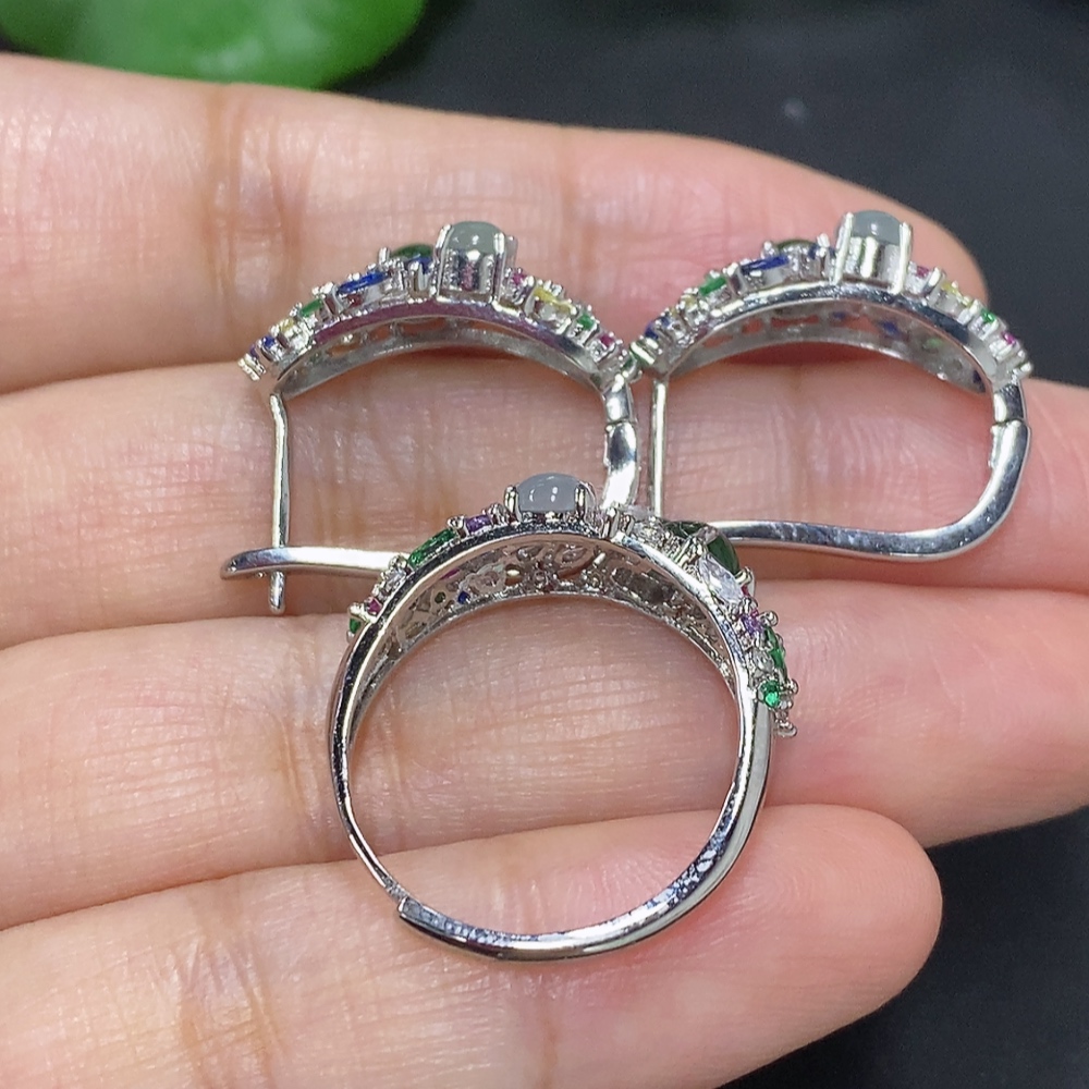 Jadeite Inlaid Ring and Earring Set Sell as a Lot Adjustable Size Non-Gold Inlaid