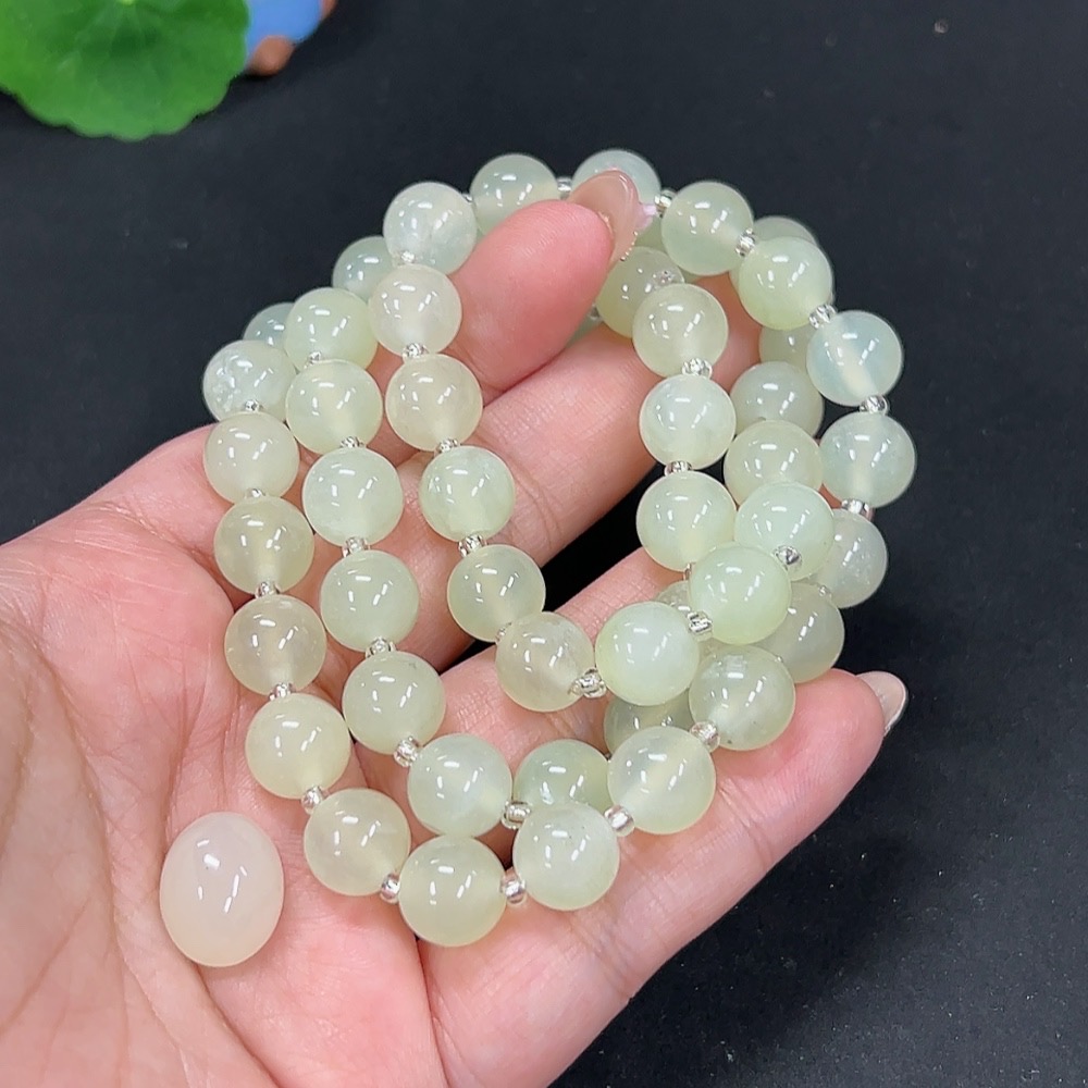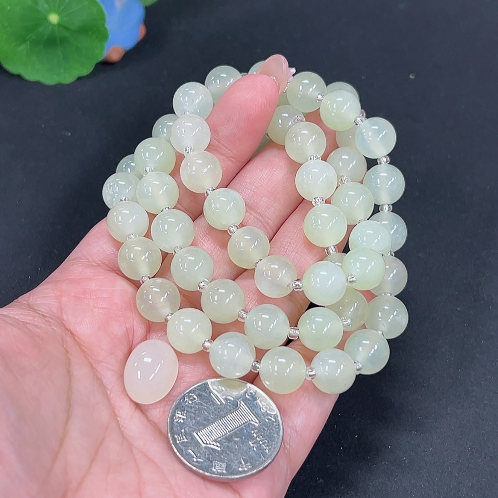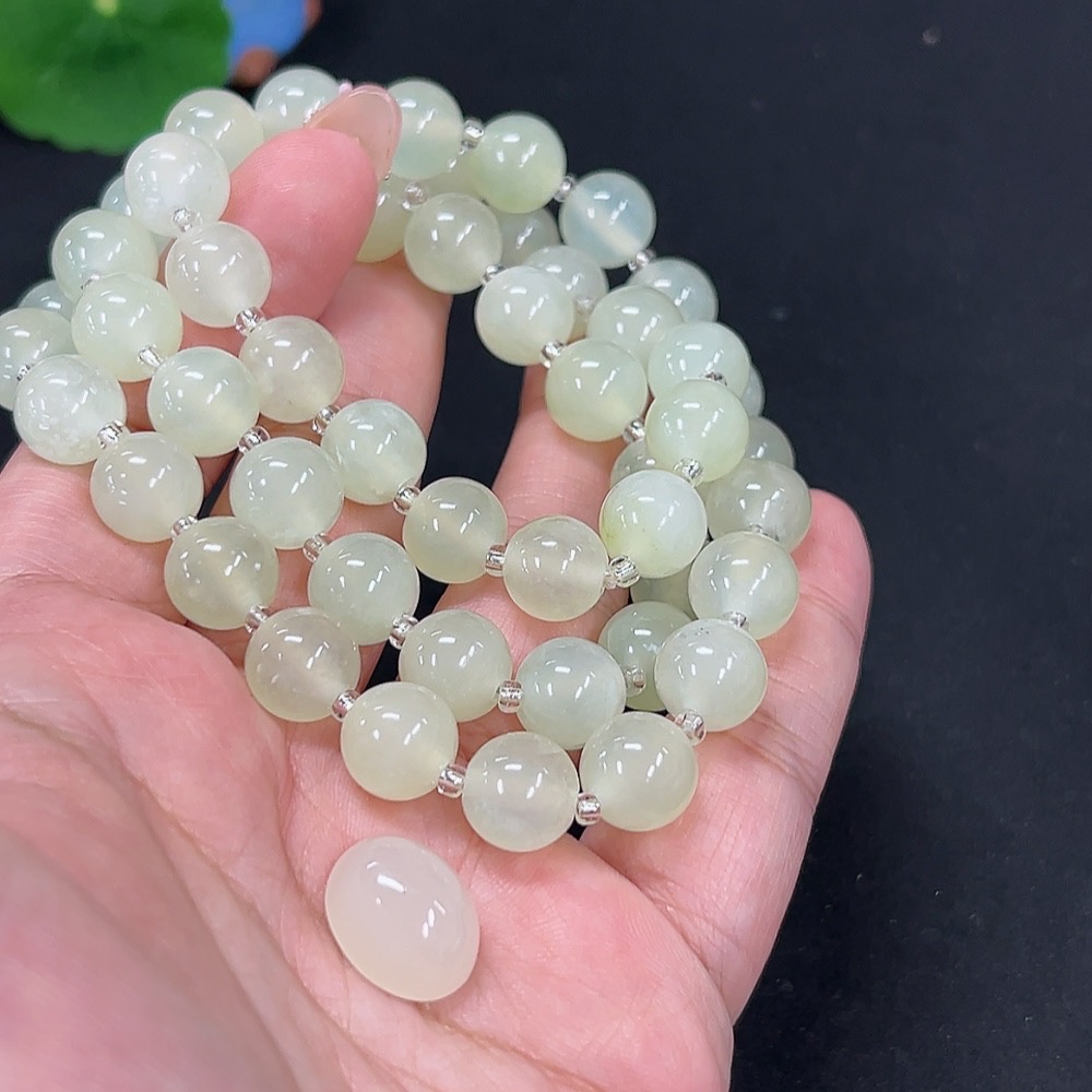 Xiuyan jade (serpentine jade) bead chain + cabochon