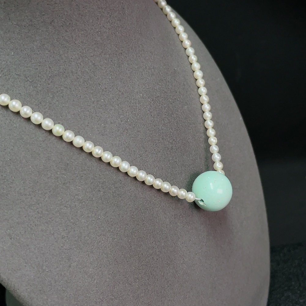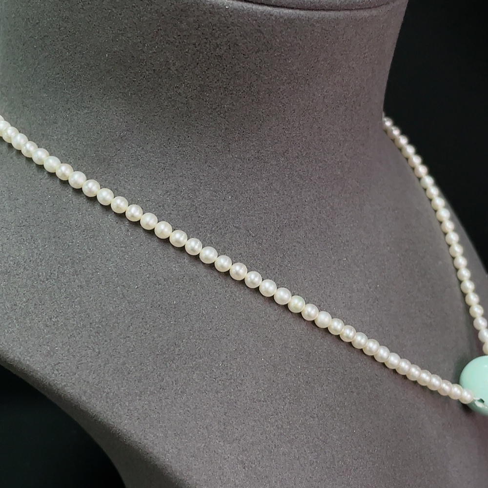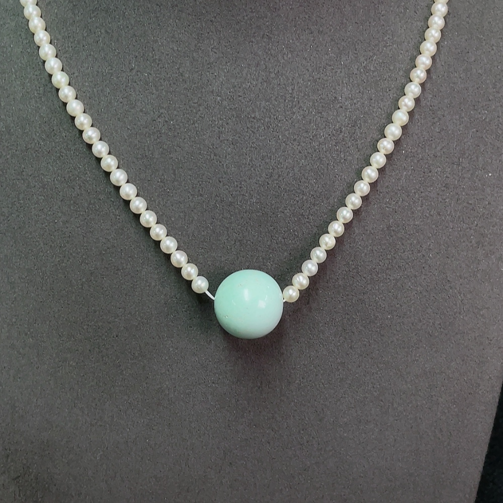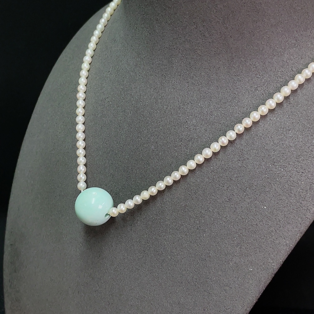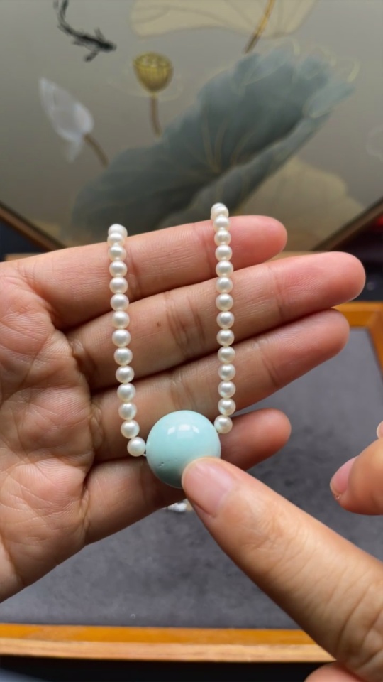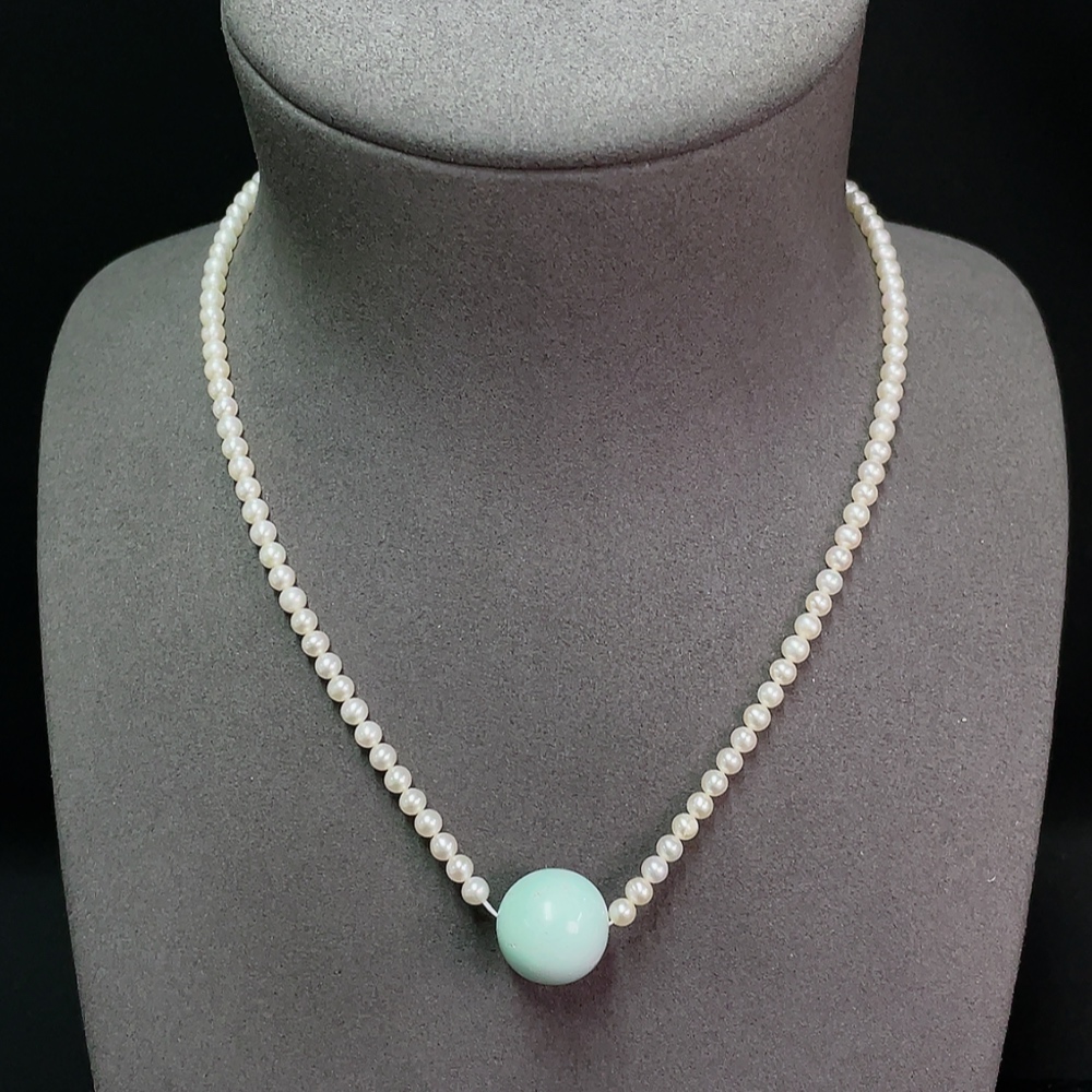 Turquoise bead necklace with pearls, color origin undetermined, non-gold, total weight approximately 14.34g, including chain card about 15.8mm