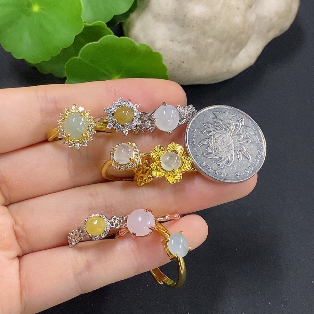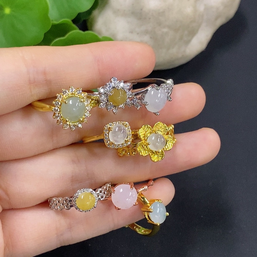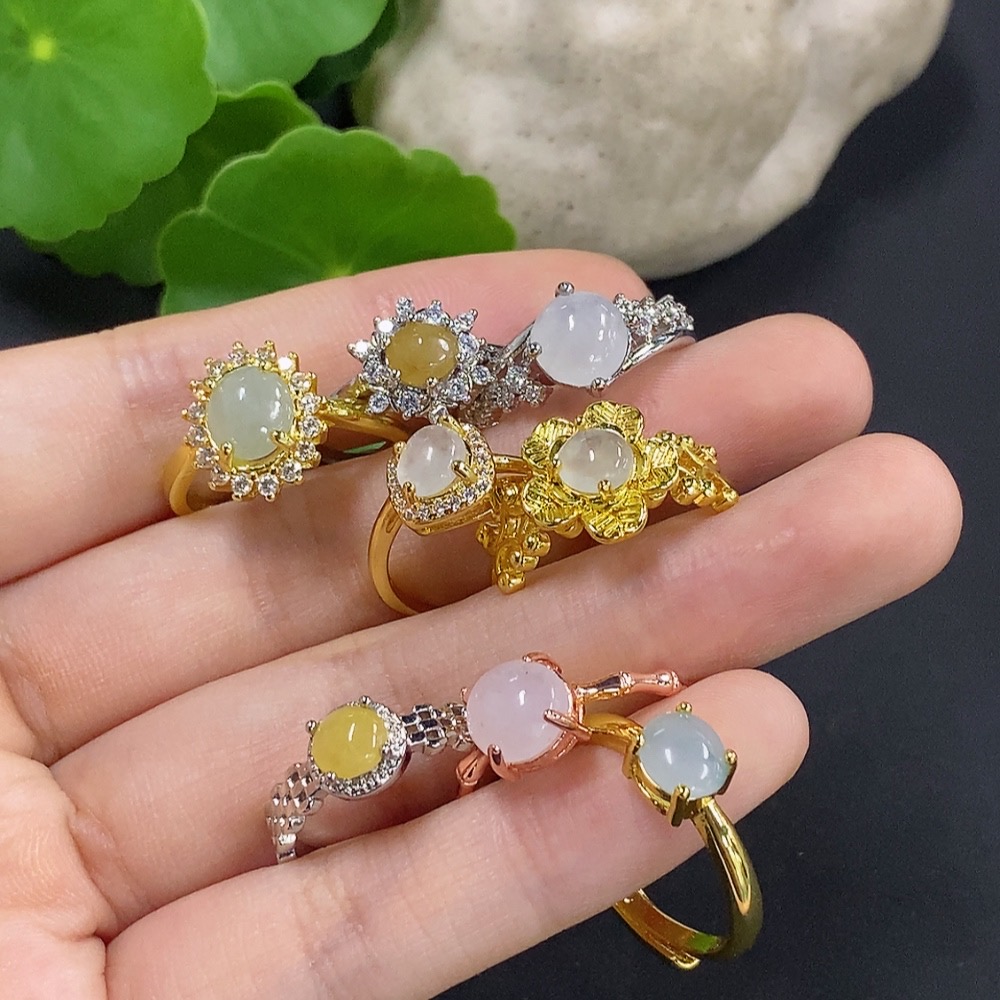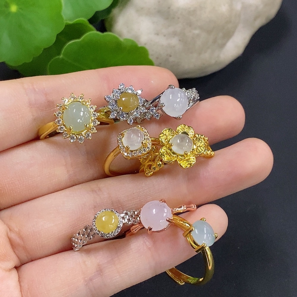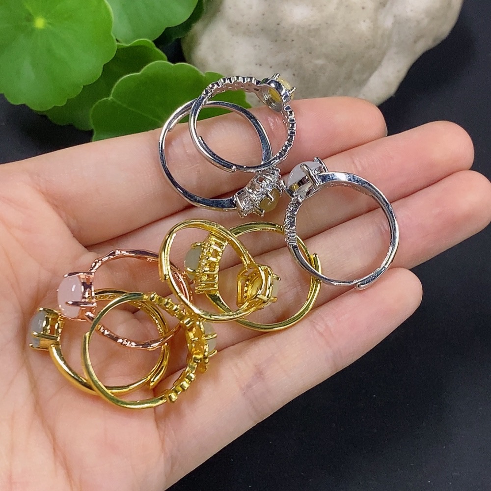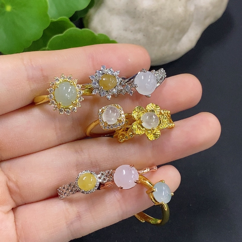 Jadeite Cabochon Inlay Ring Non-Gold Setting Adjustable Size