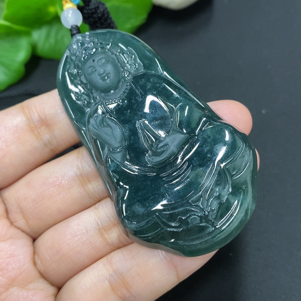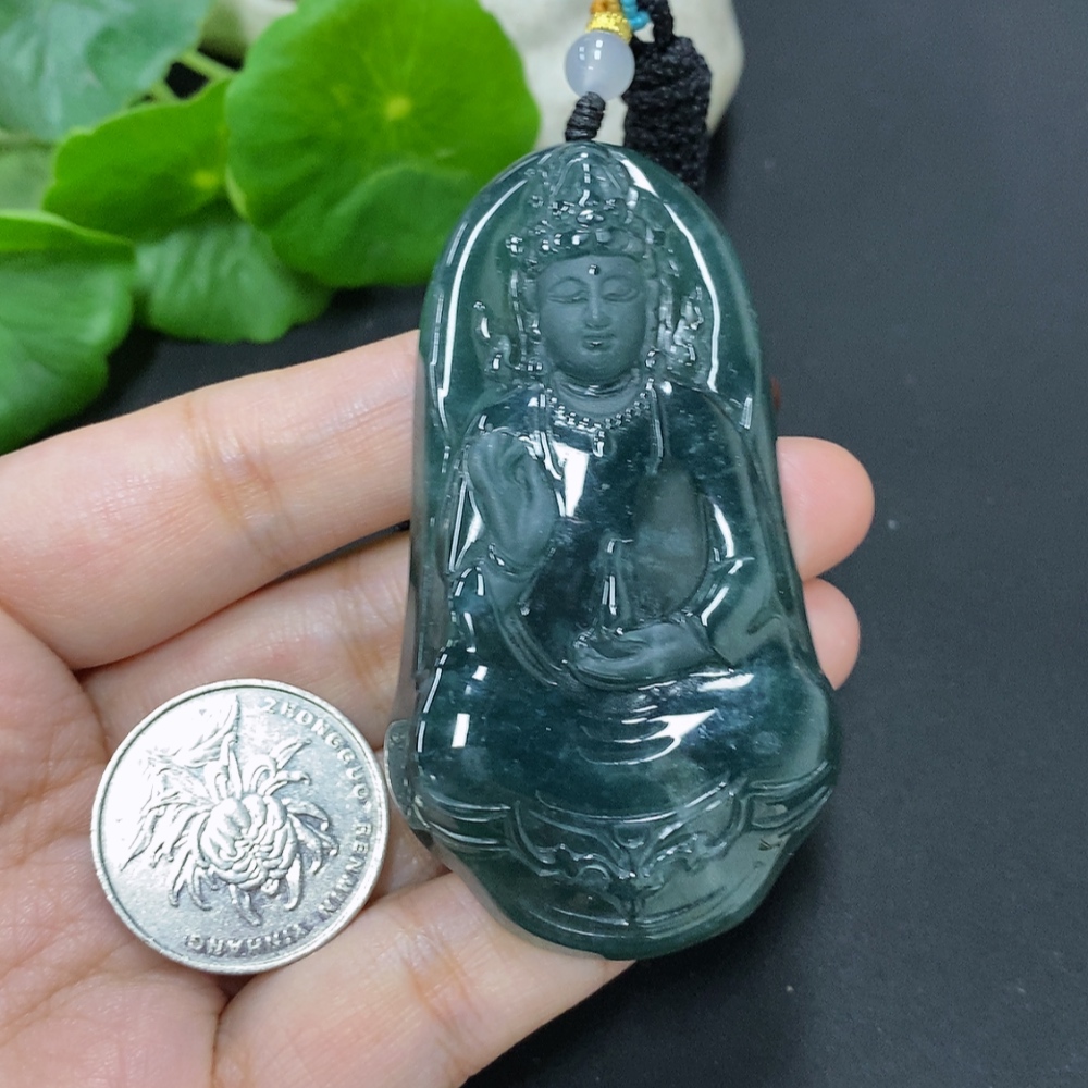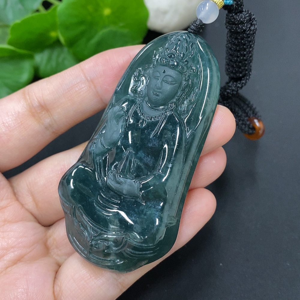 Jadeite Guanyin Pendant, Total Weight Including Rope Approximately 46g