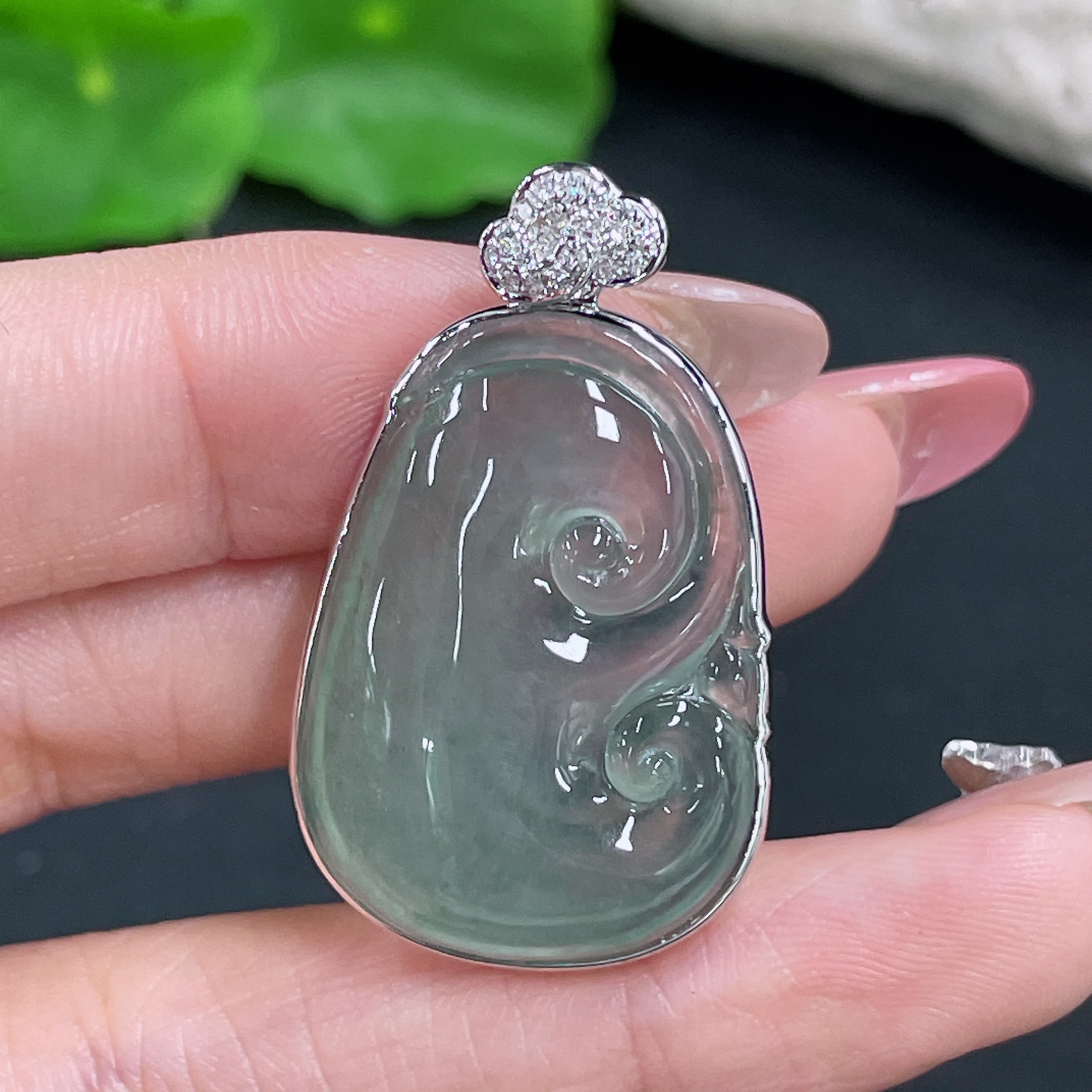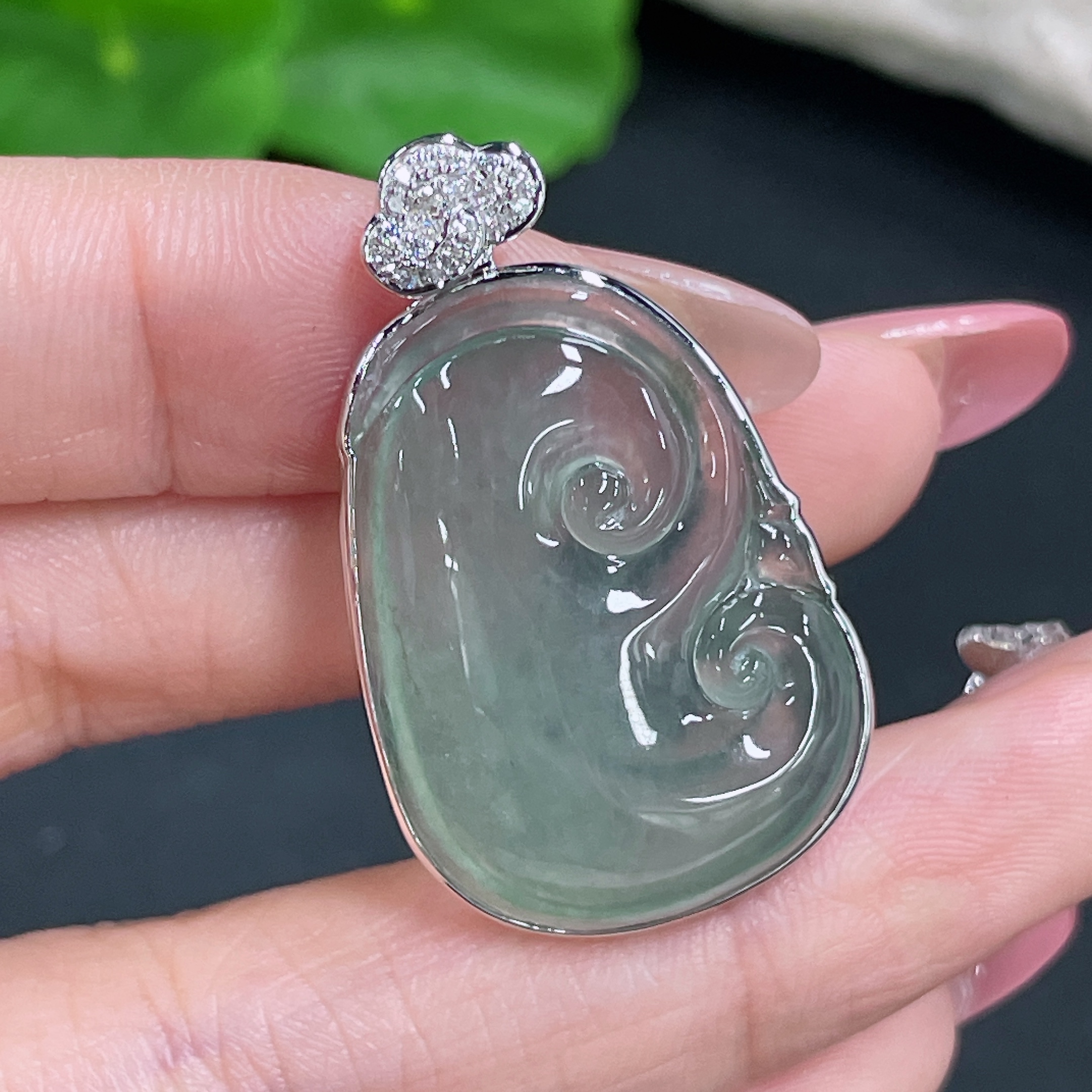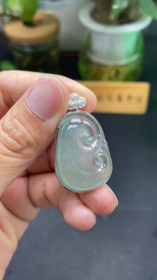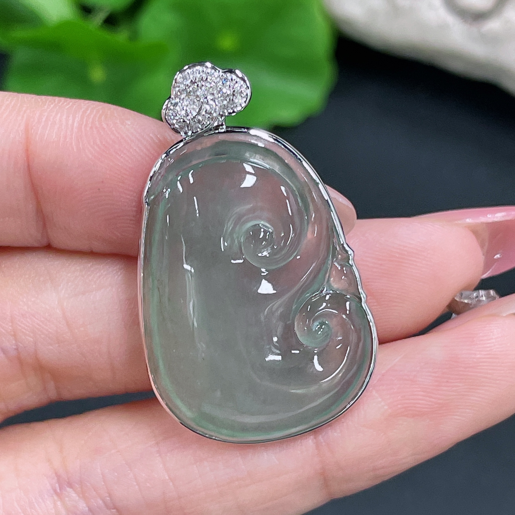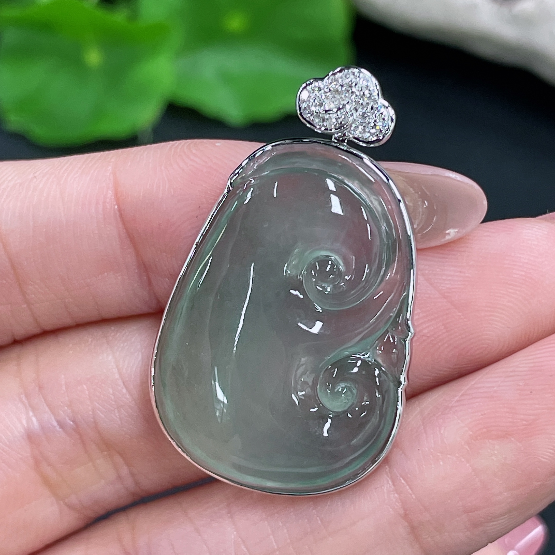 Jadeite Pendant Ruyi Set with 18K Gold and Diamonds Total Weight Approx. 8.17g