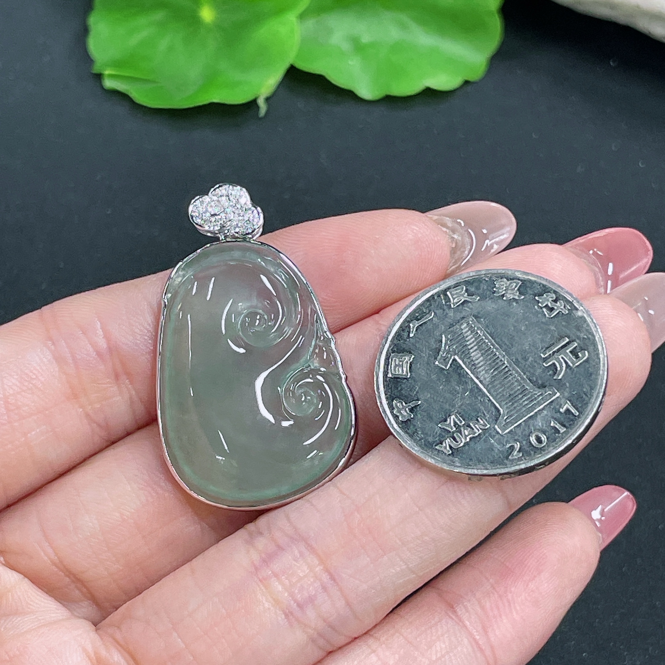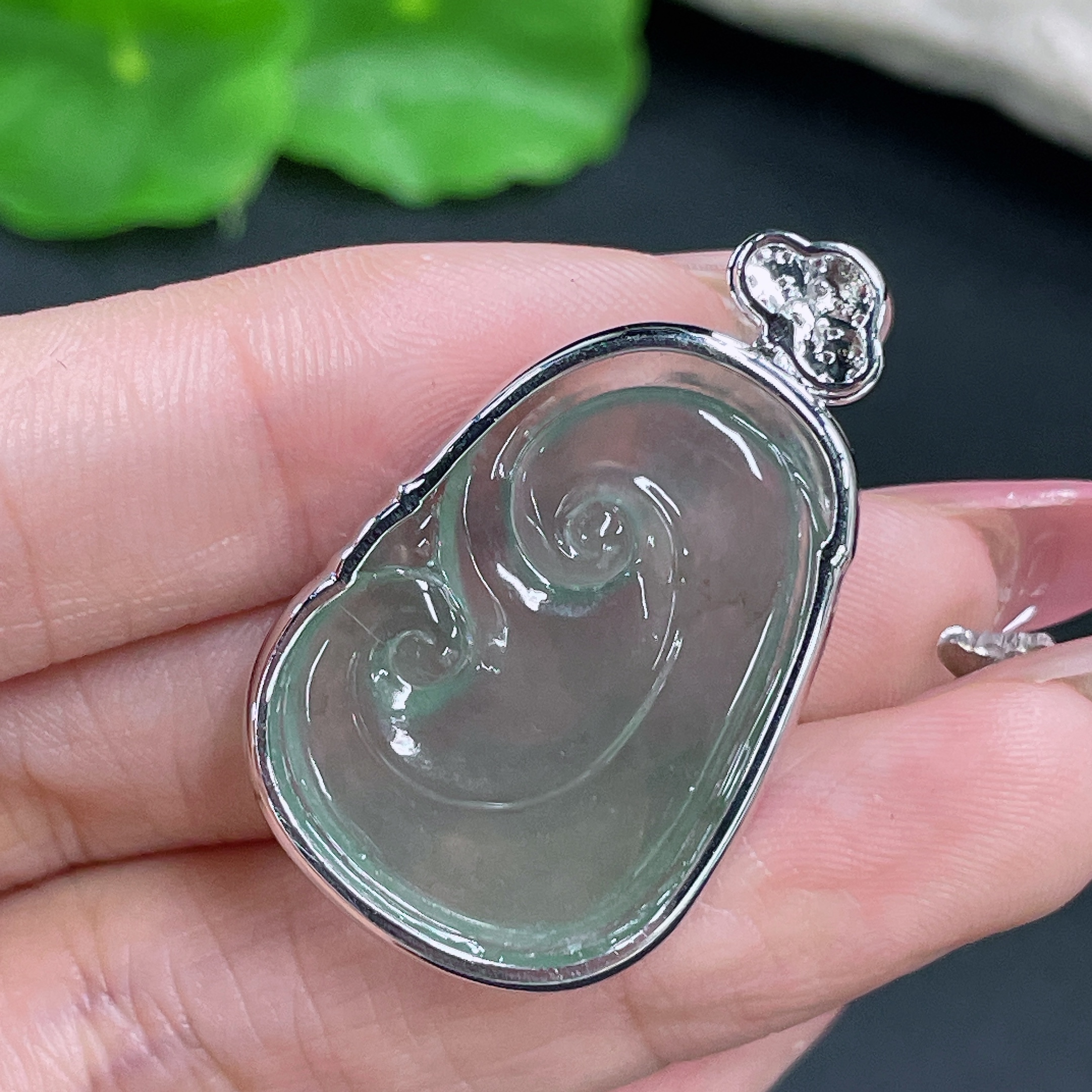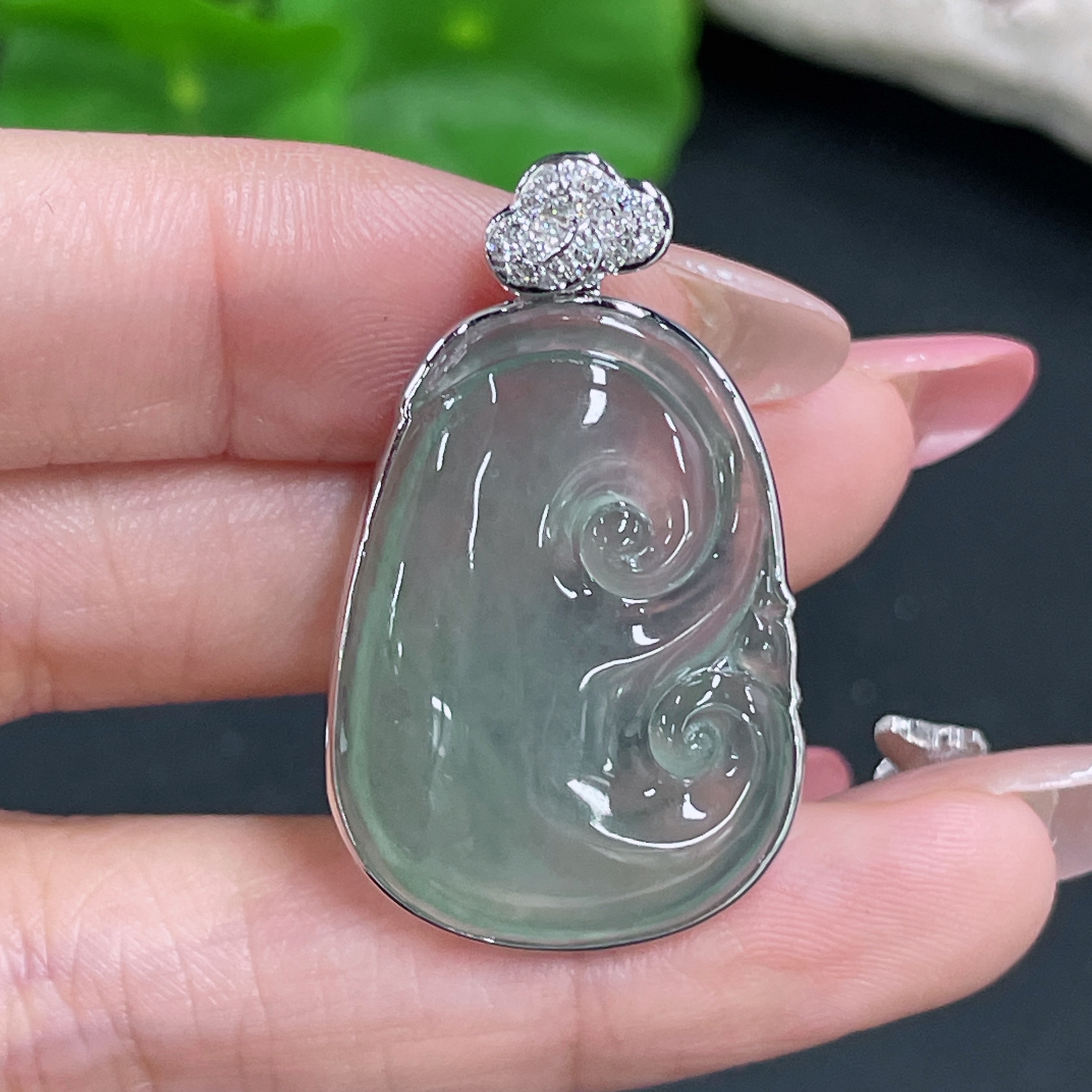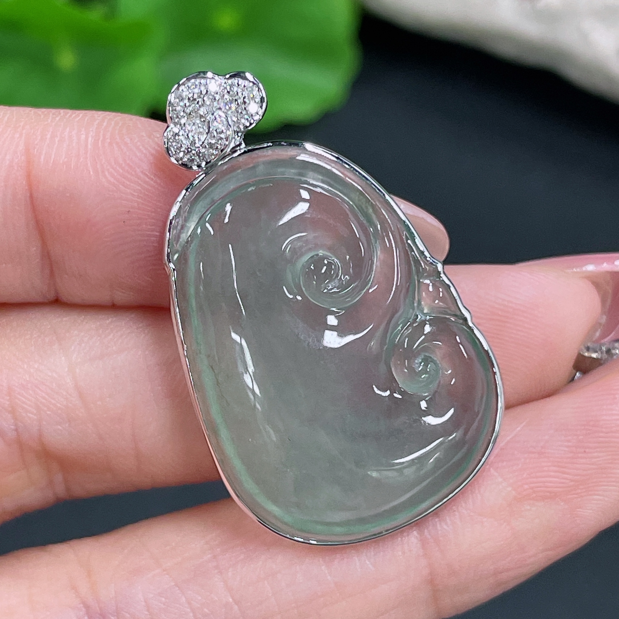 Jadeite Pendant Ruyi Set with 18K Gold and Diamonds Total Weight Approx. 8.17g
