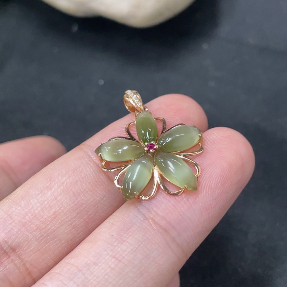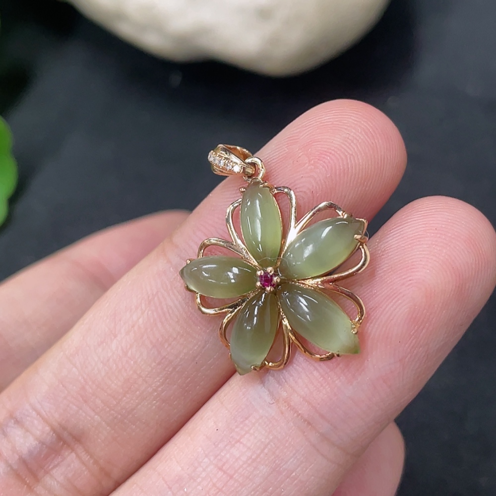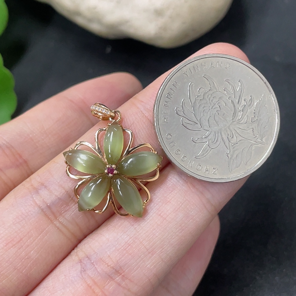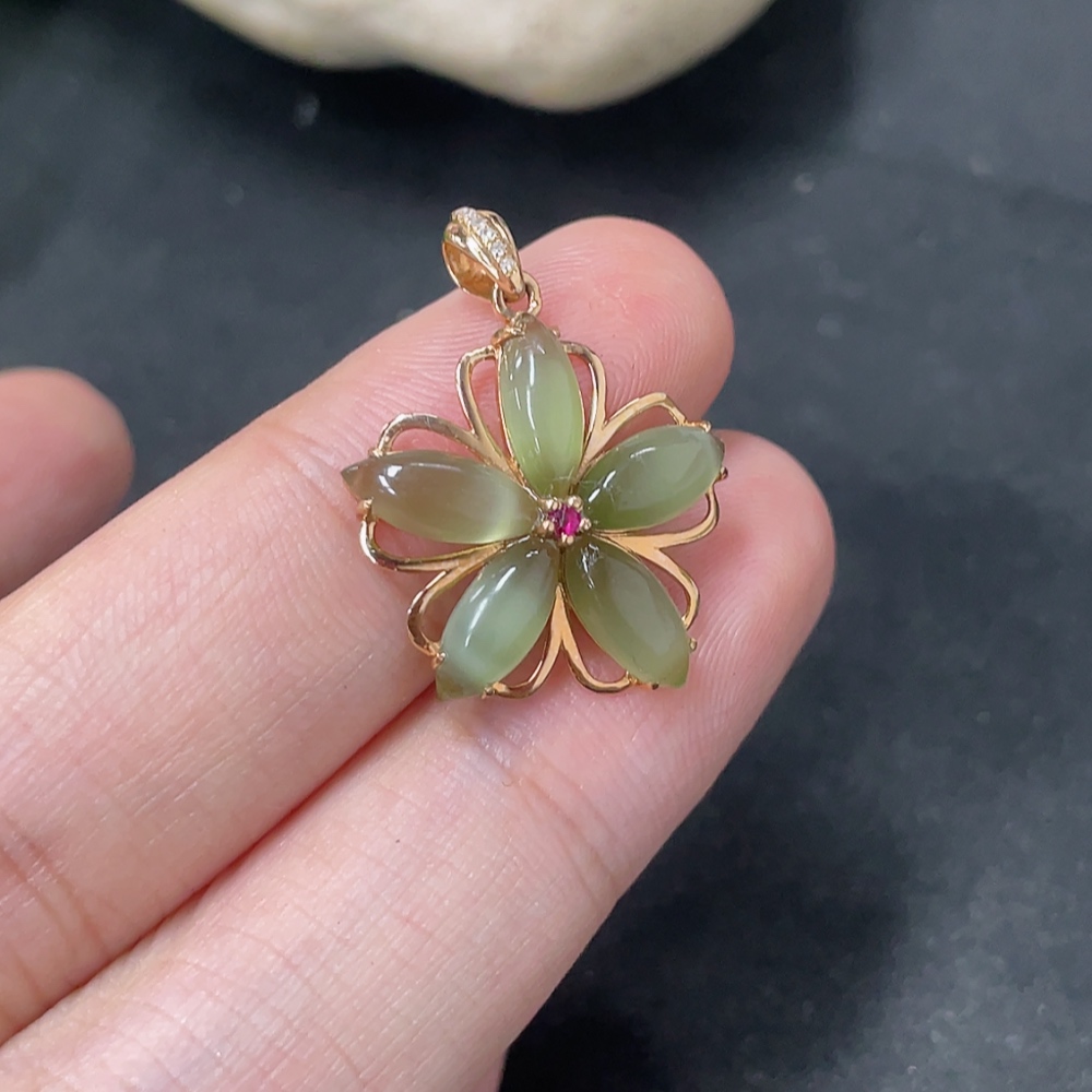 Hetian Jade Jasper Inlaid Pendant, 18K Gold, Total Weight Approx. 1.5g, Diamond Accents