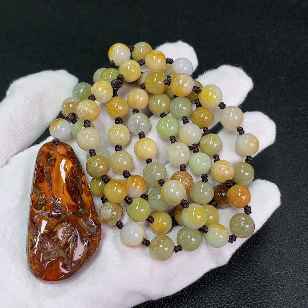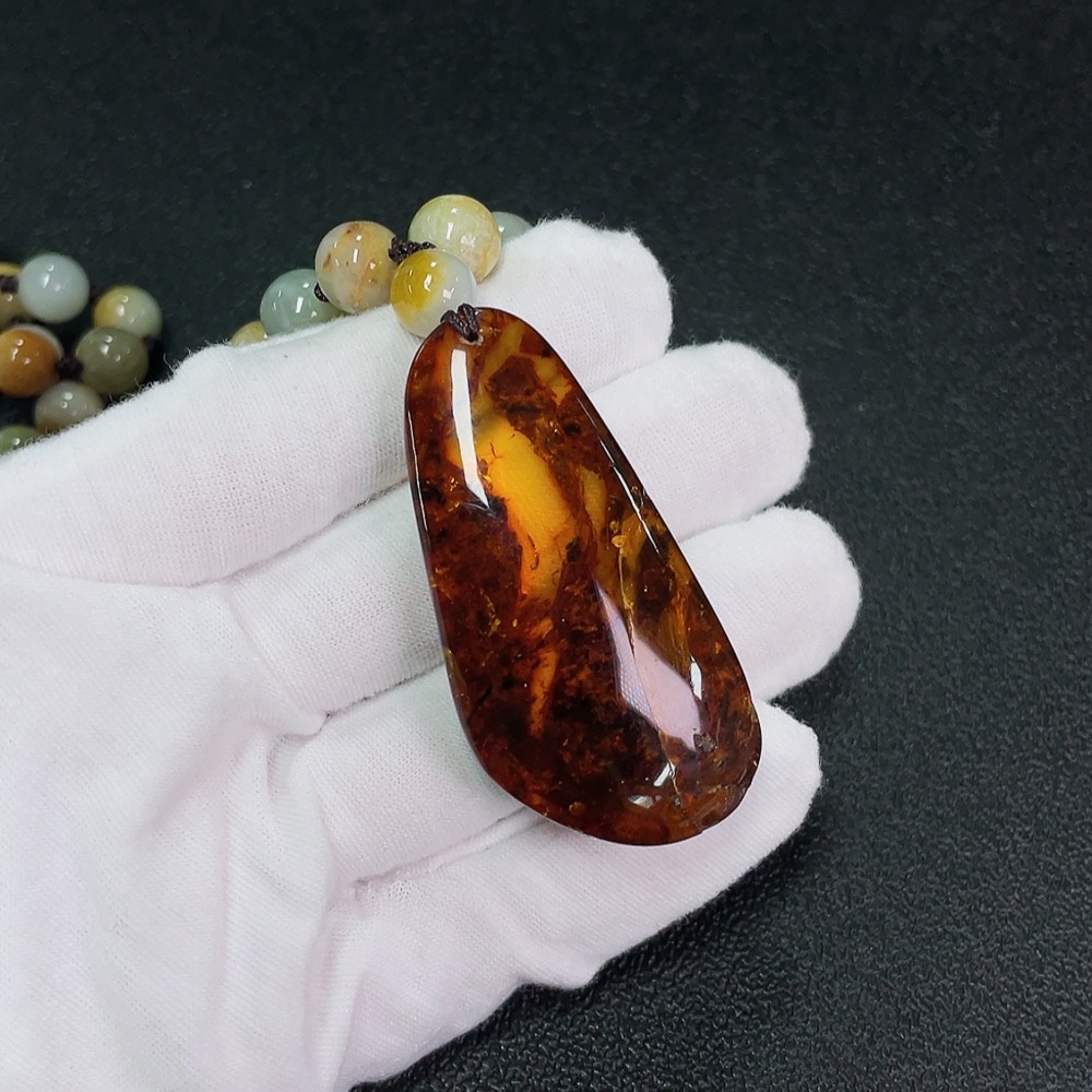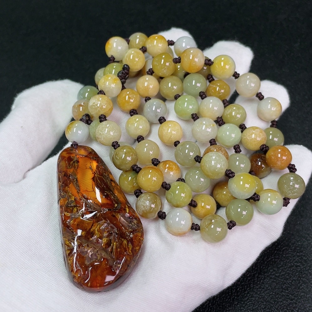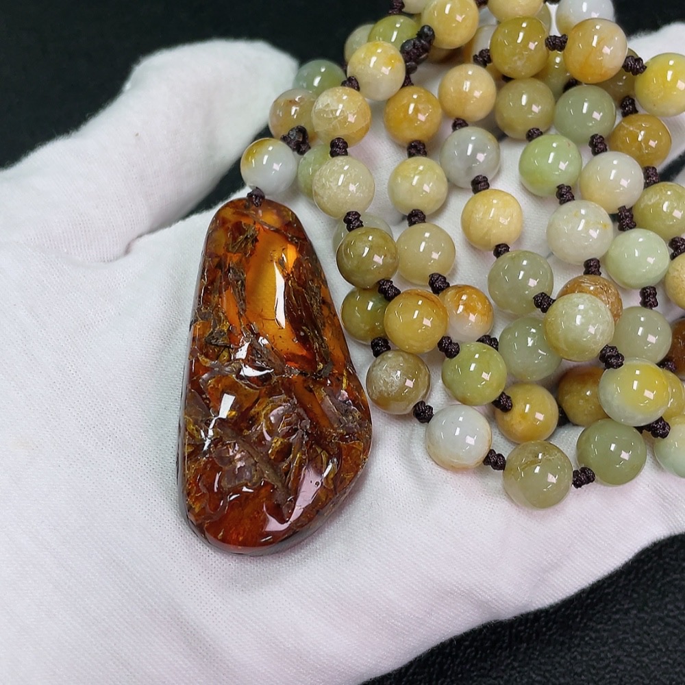 Amber Beeswax Pendant with Jadeite (Total Weight Including Cord: Approx. 107.89g)