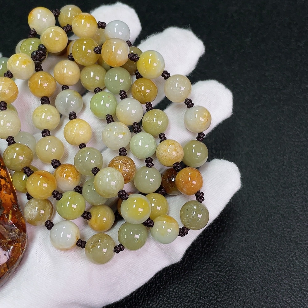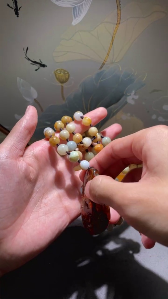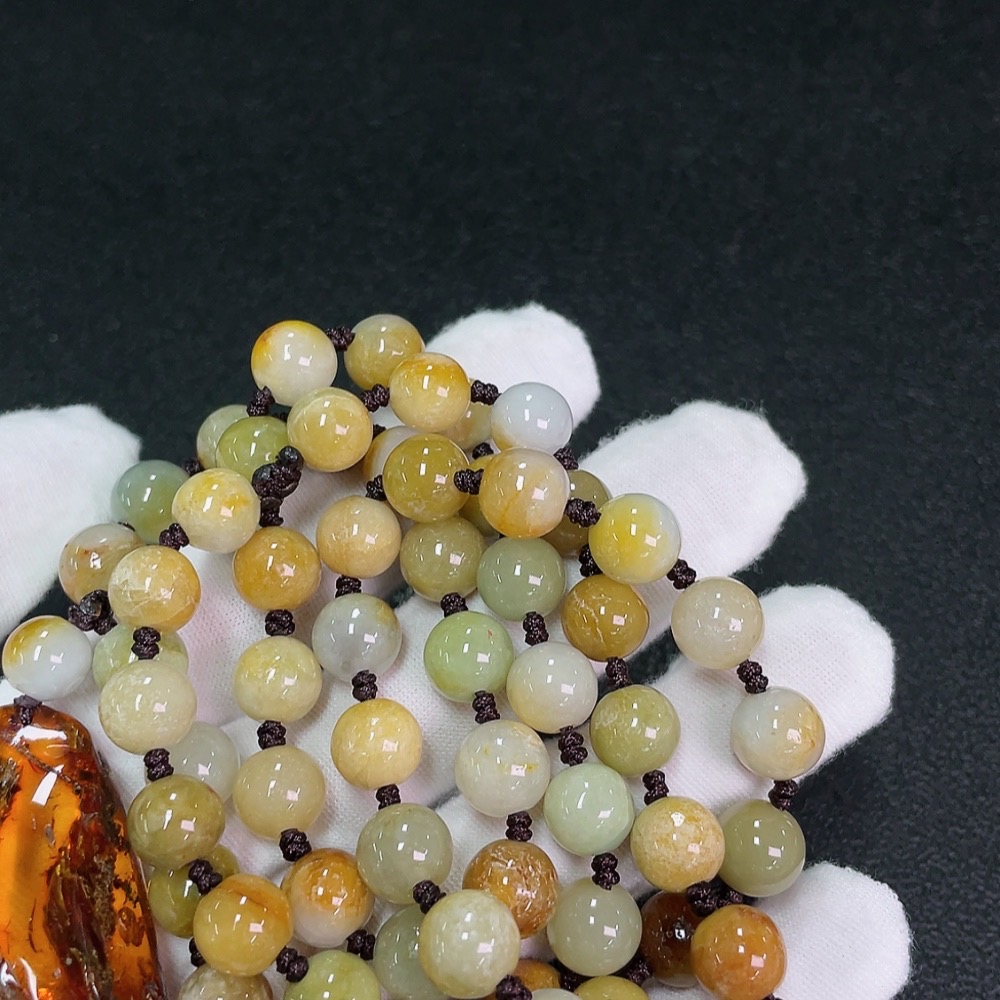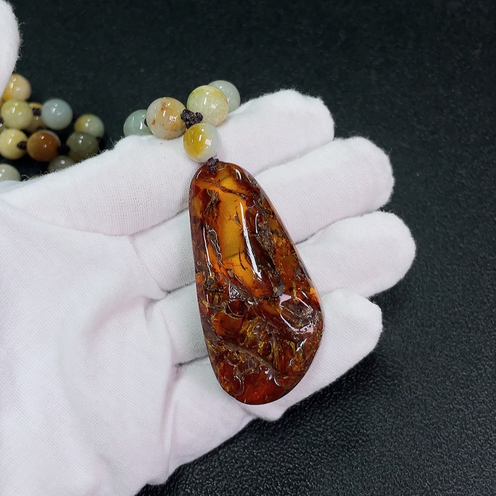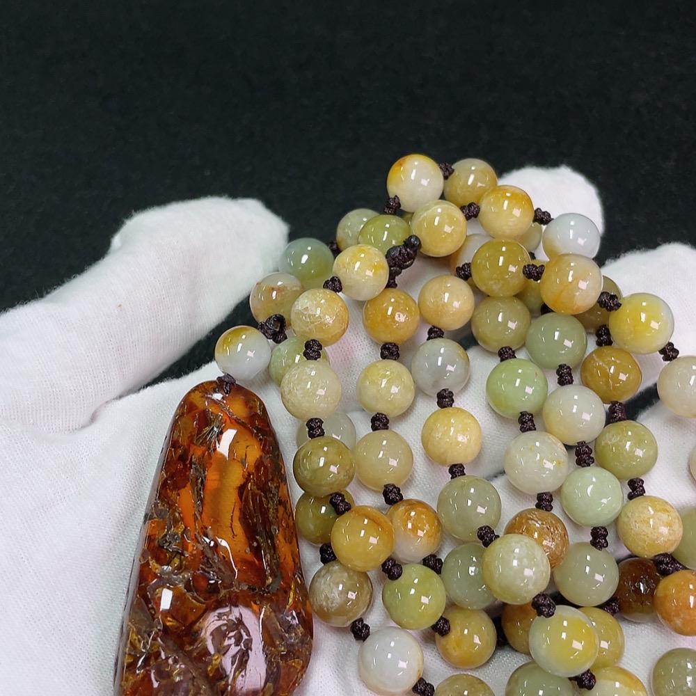 Amber Beeswax Pendant with Jadeite (Total Weight Including Cord: Approx. 107.89g)