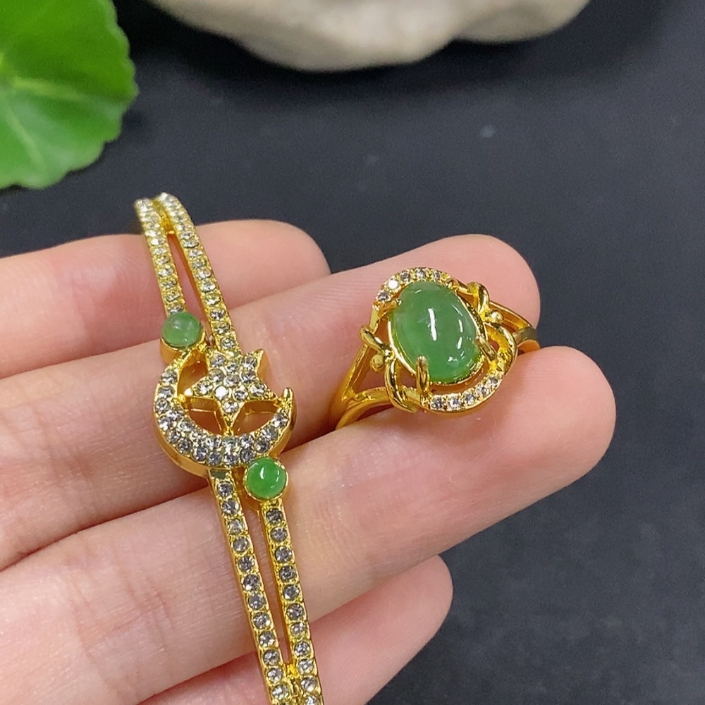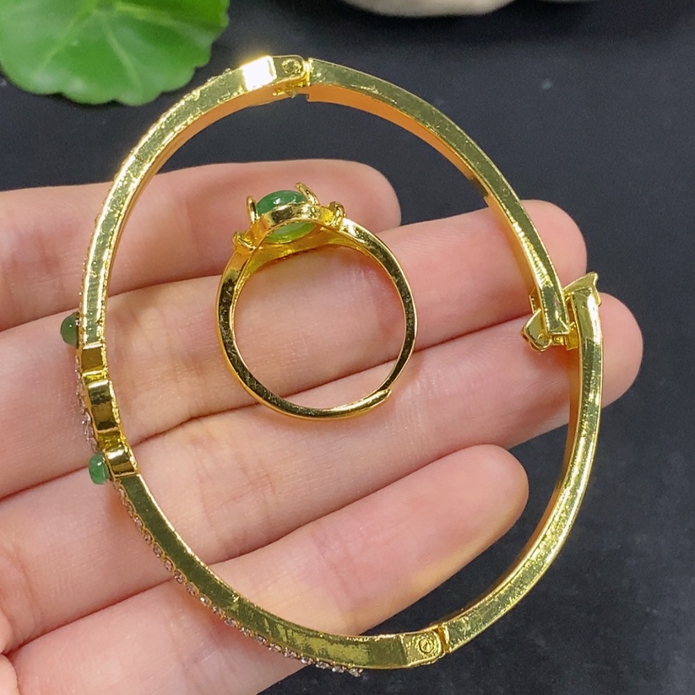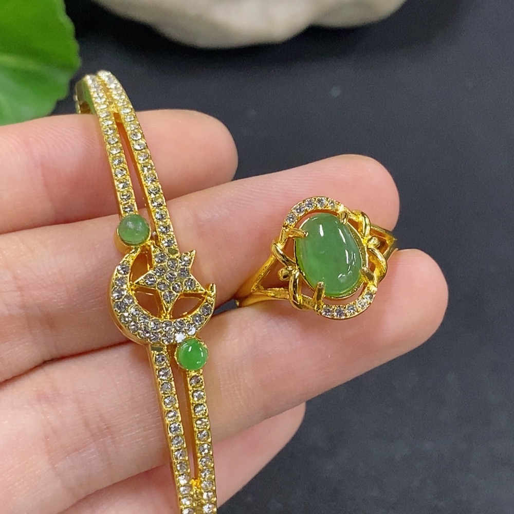 Jadeite Inlaid Ring + Bracelet Sell as a Lot Non-Gold Inlaid Adjustable