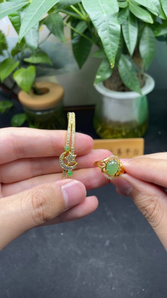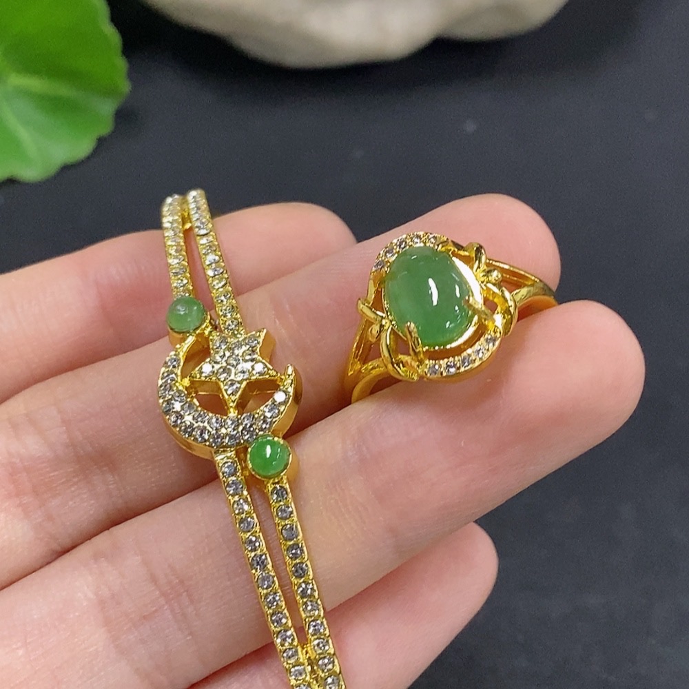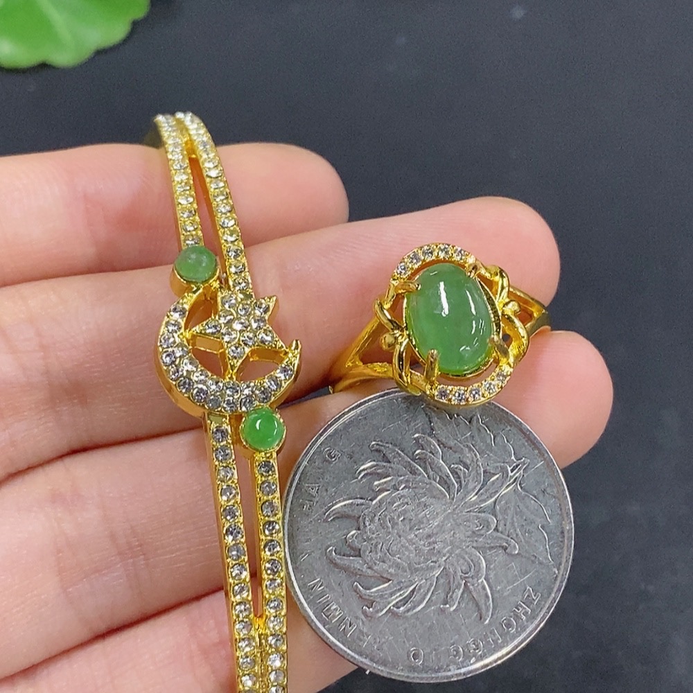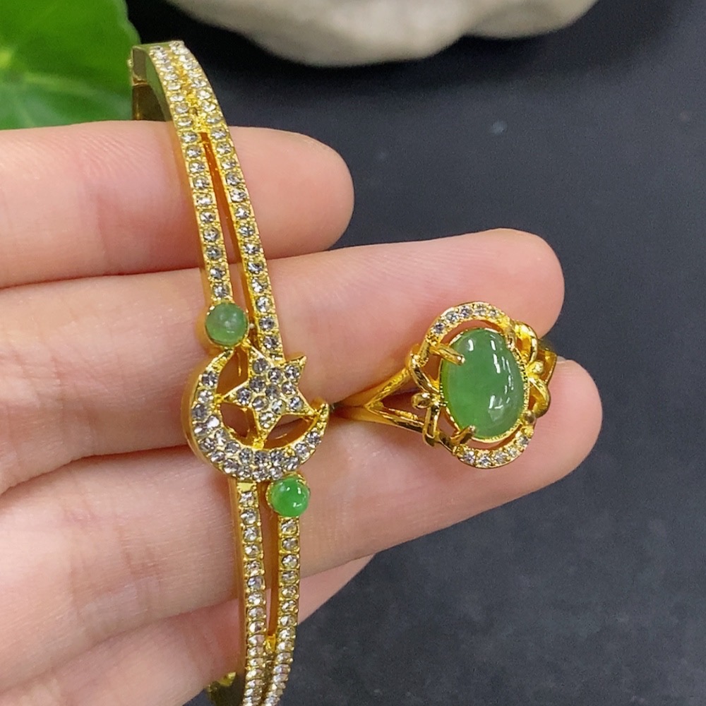 Jadeite Inlaid Ring + Bracelet Sell as a Lot Non-Gold Inlaid Adjustable