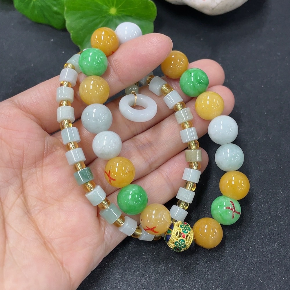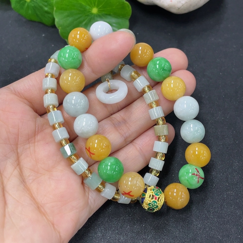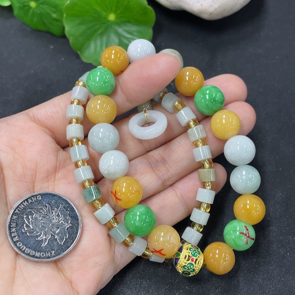 Jadeite Bracelet Sell as a Lot with Non-A Beads (Yellow, Green) Non-Gold