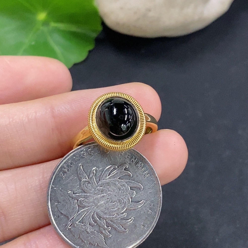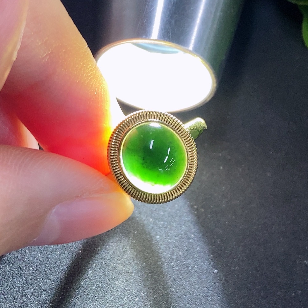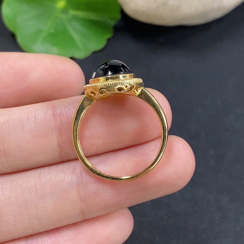 Jadeite cabochon inlay ring 18K gold size 14 total weight approx. 2.5g