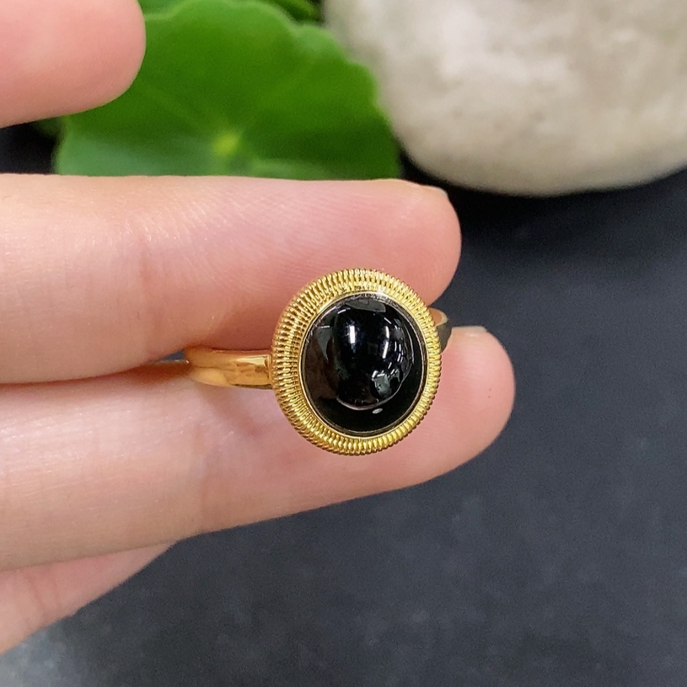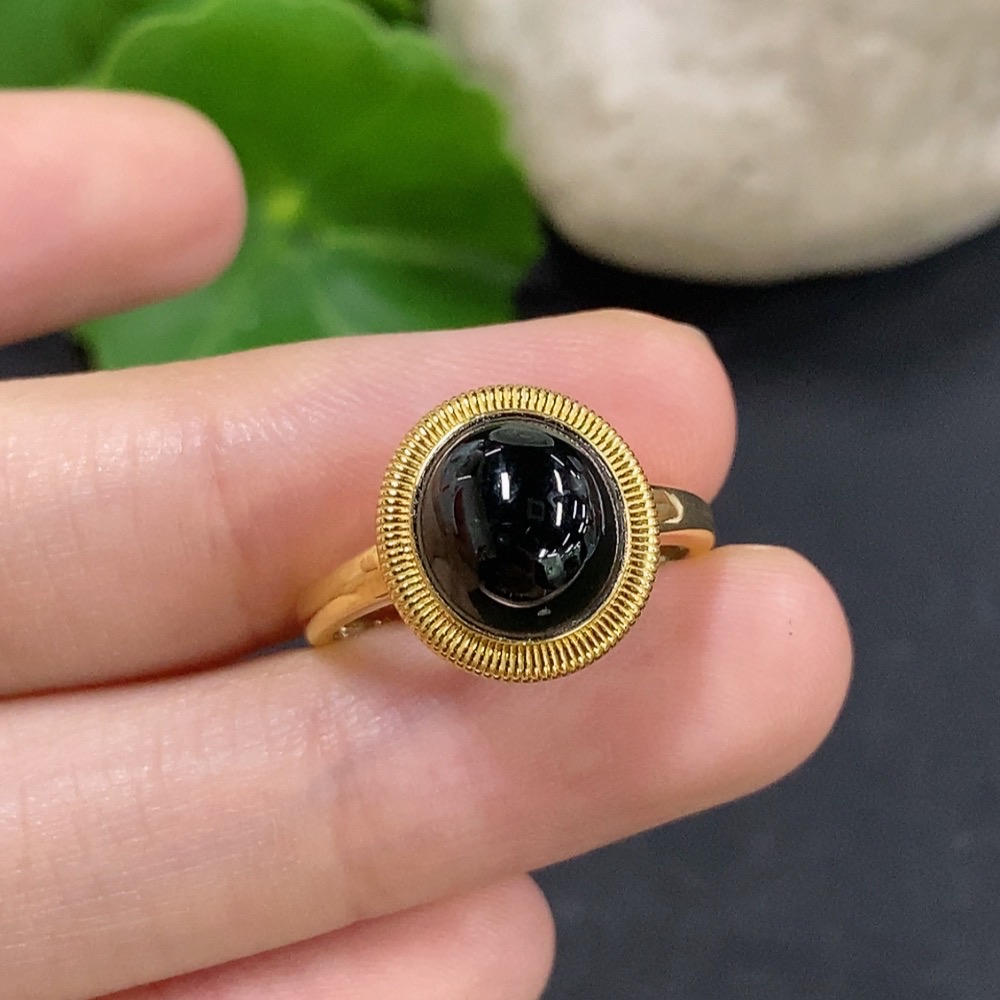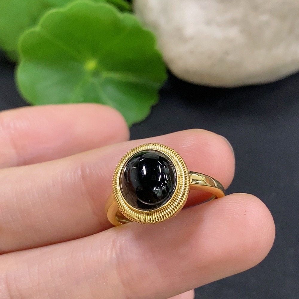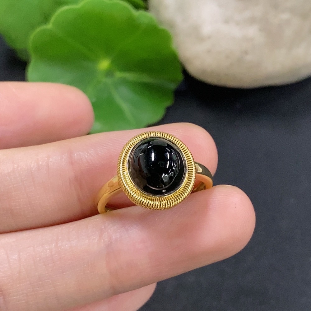 Jadeite cabochon inlay ring 18K gold size 14 total weight approx. 2.5g