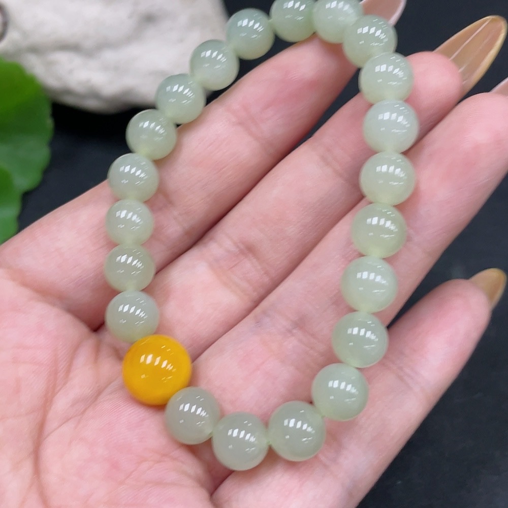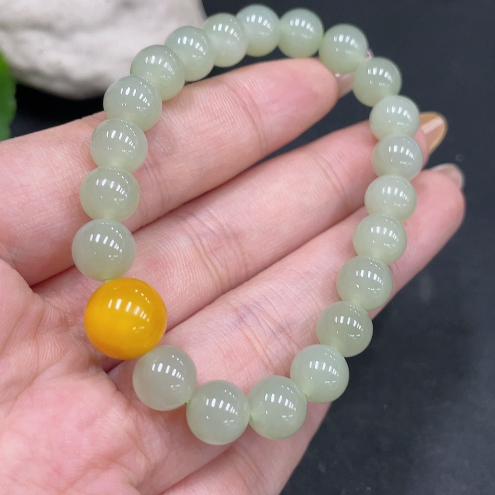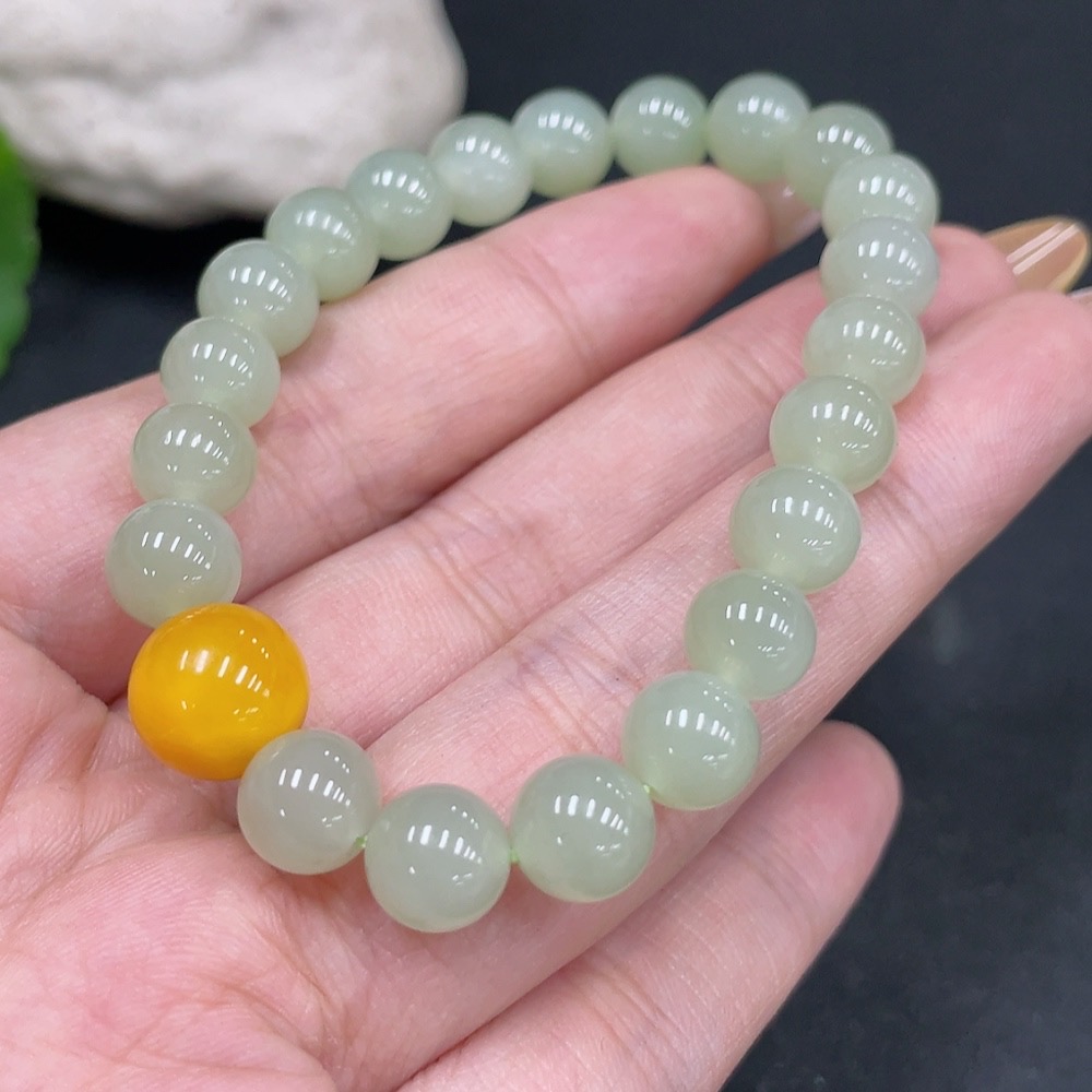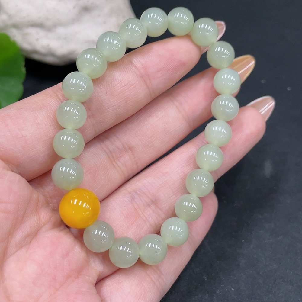 Hetian Jade Beaded Bracelet (approx. 7.5mm, total weight about 16.9g) with amber