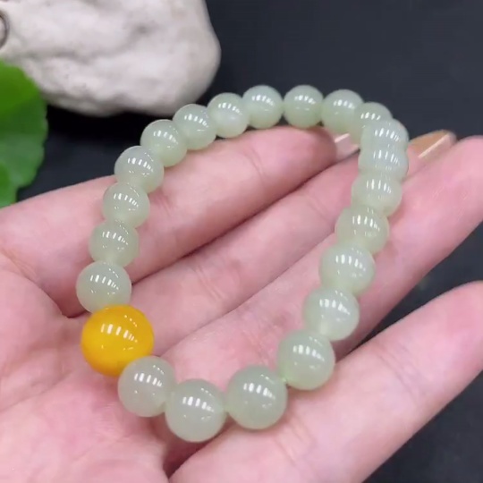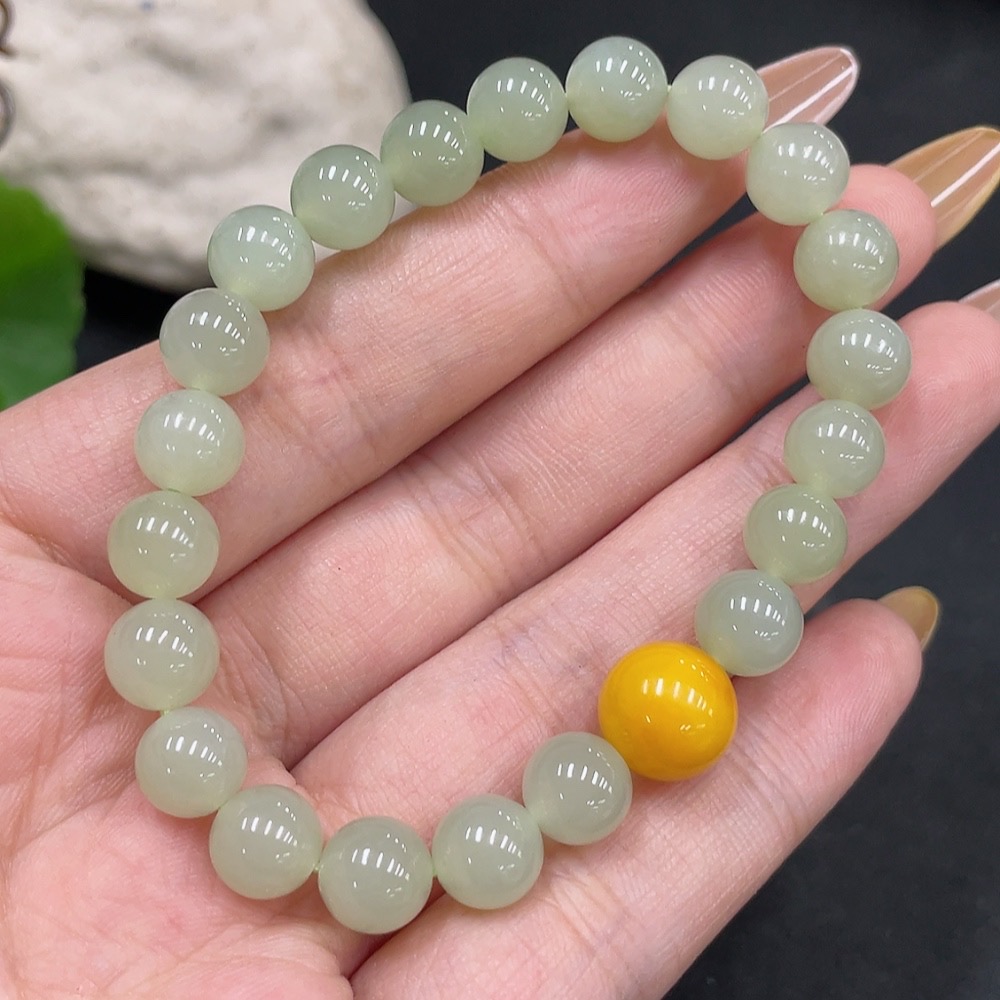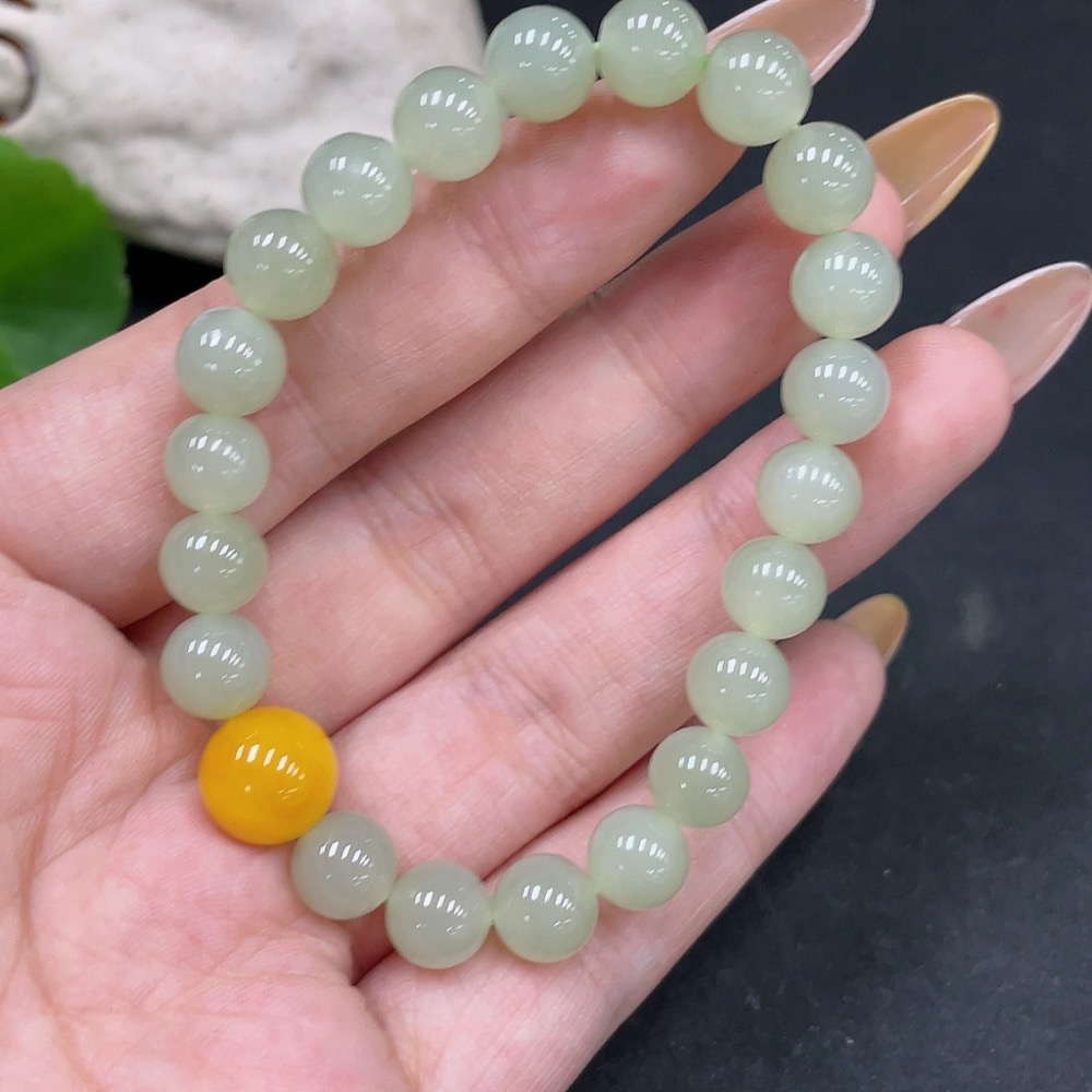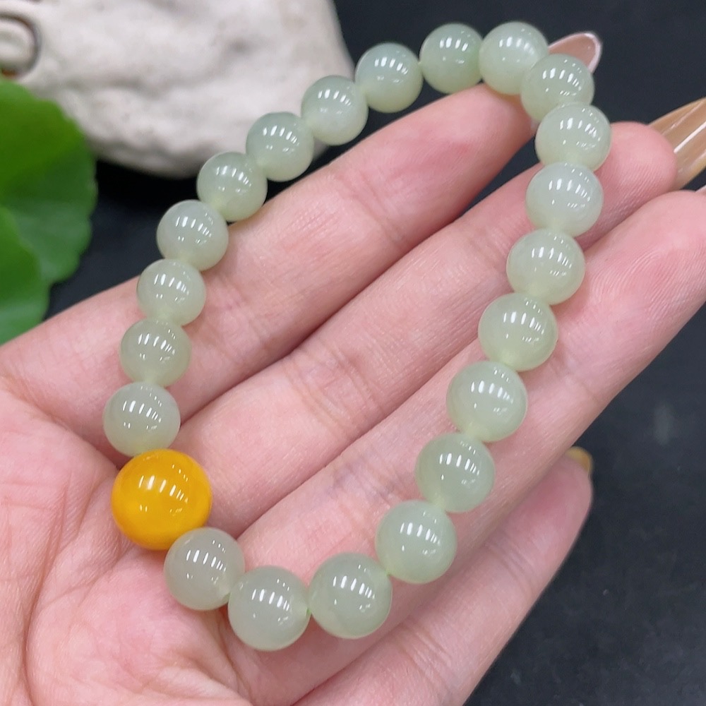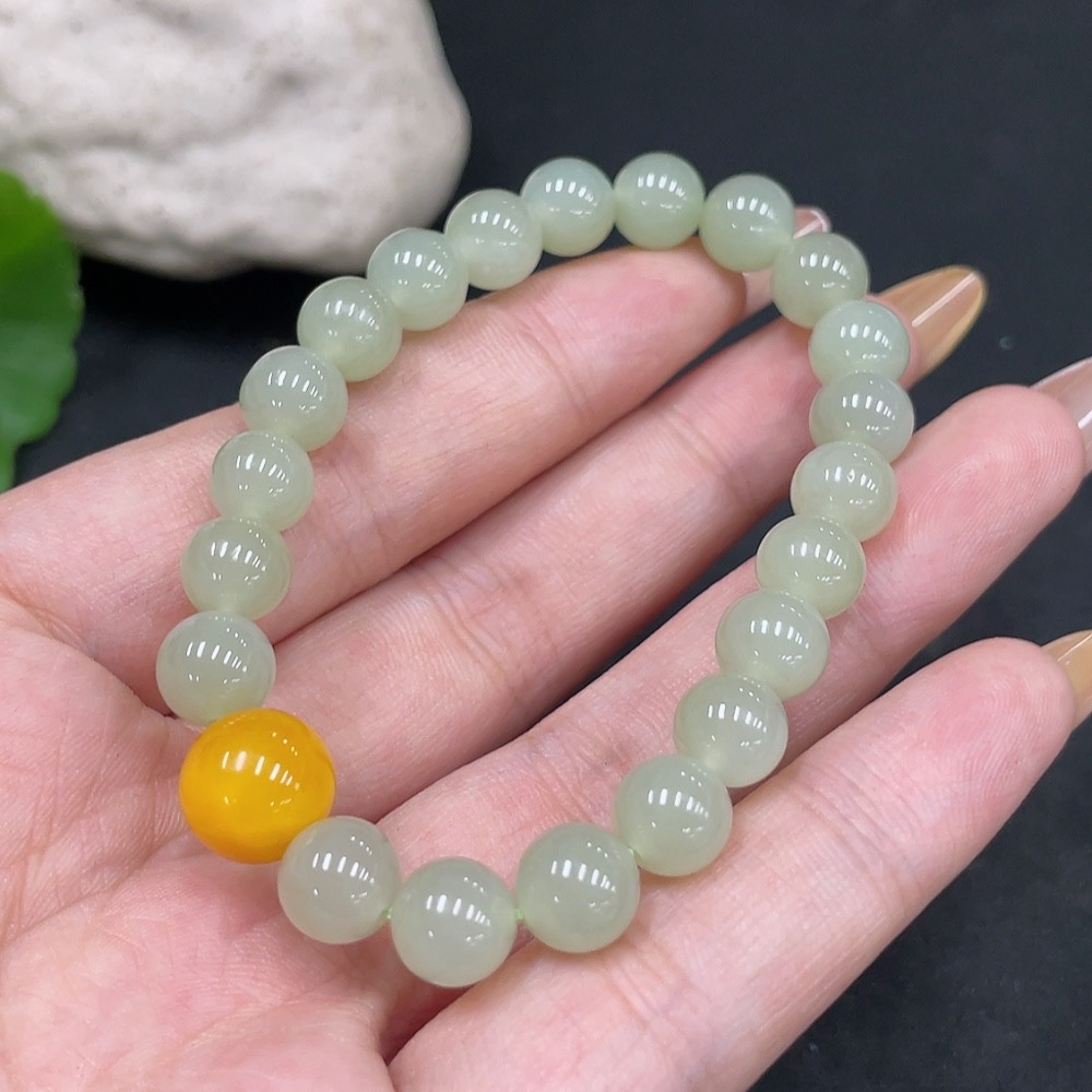 Hetian Jade Beaded Bracelet (approx. 7.5mm, total weight about 16.9g) with amber