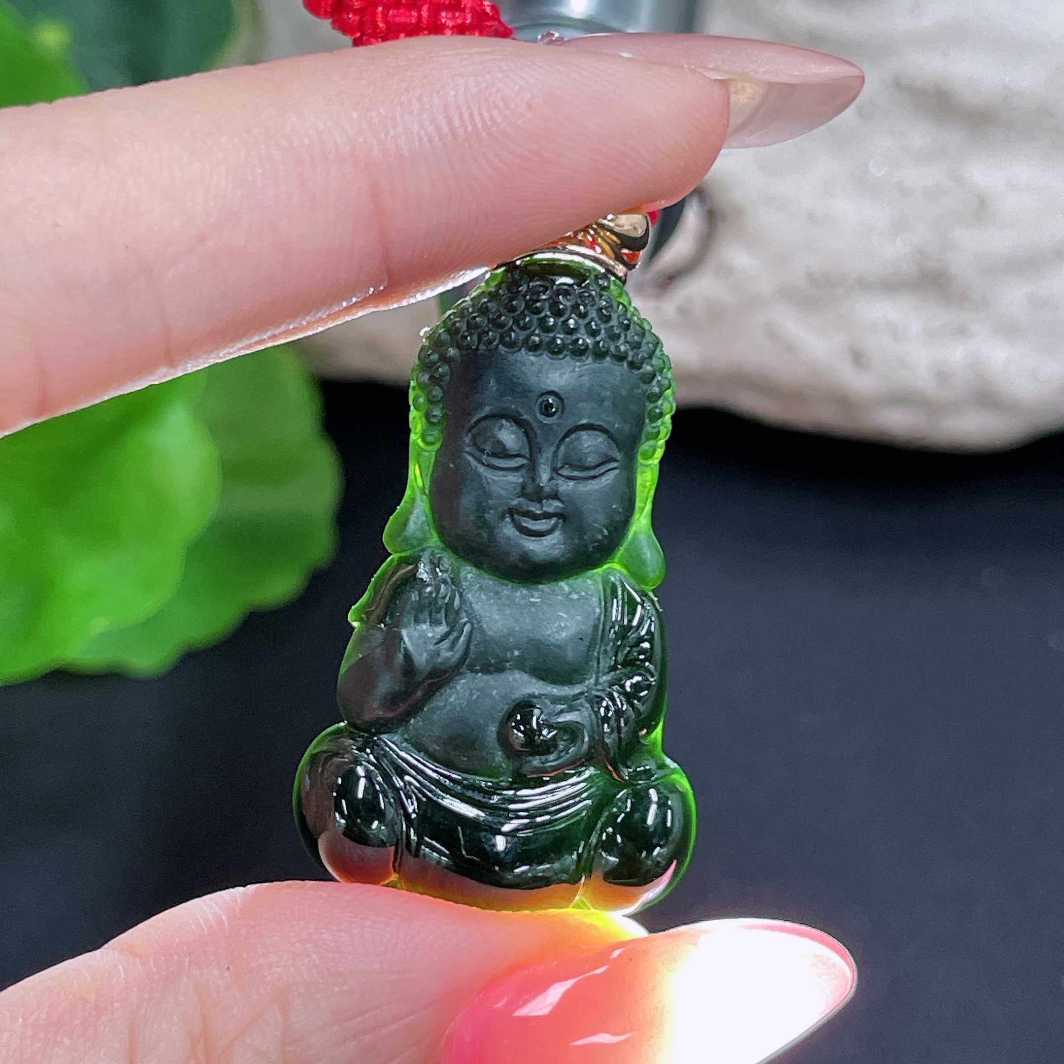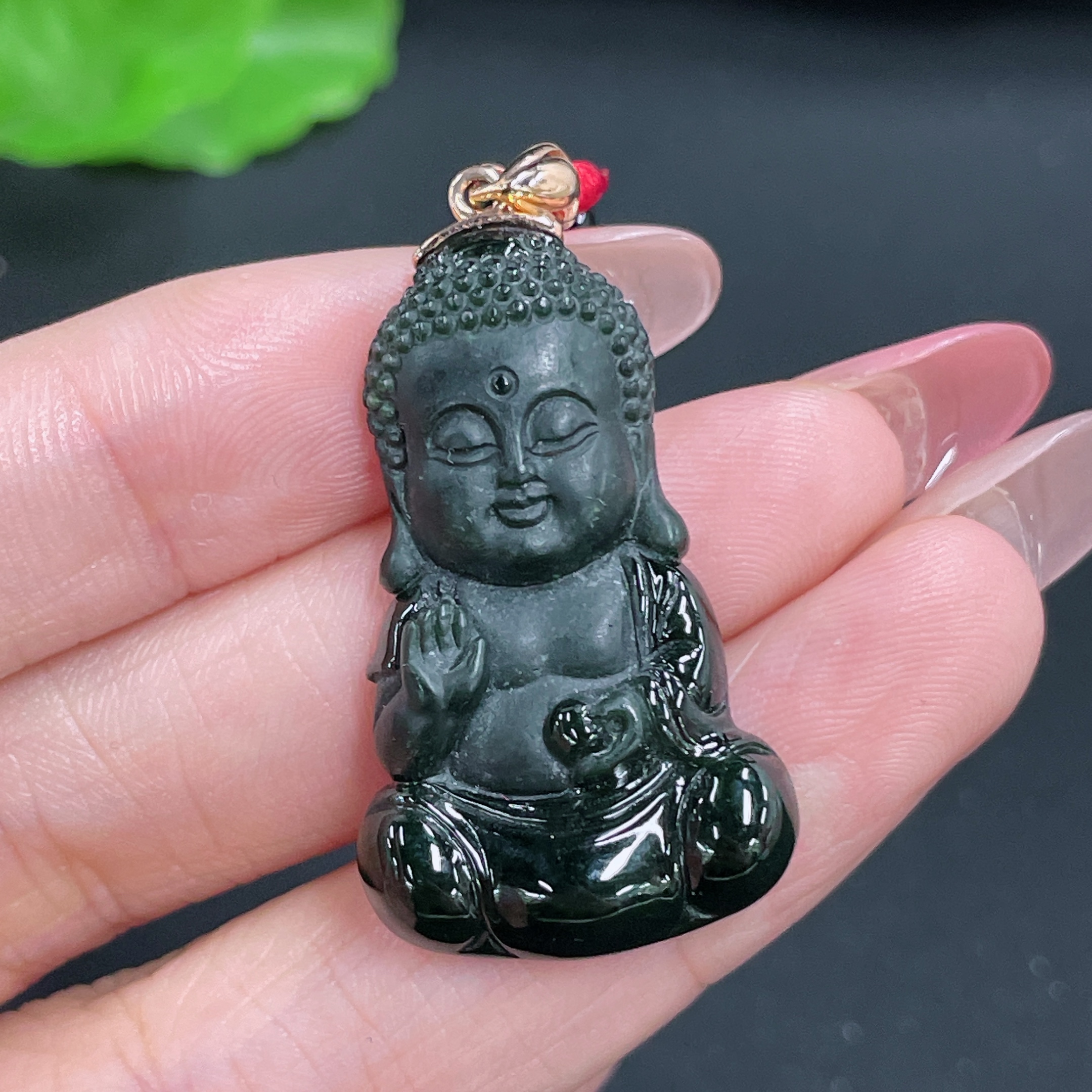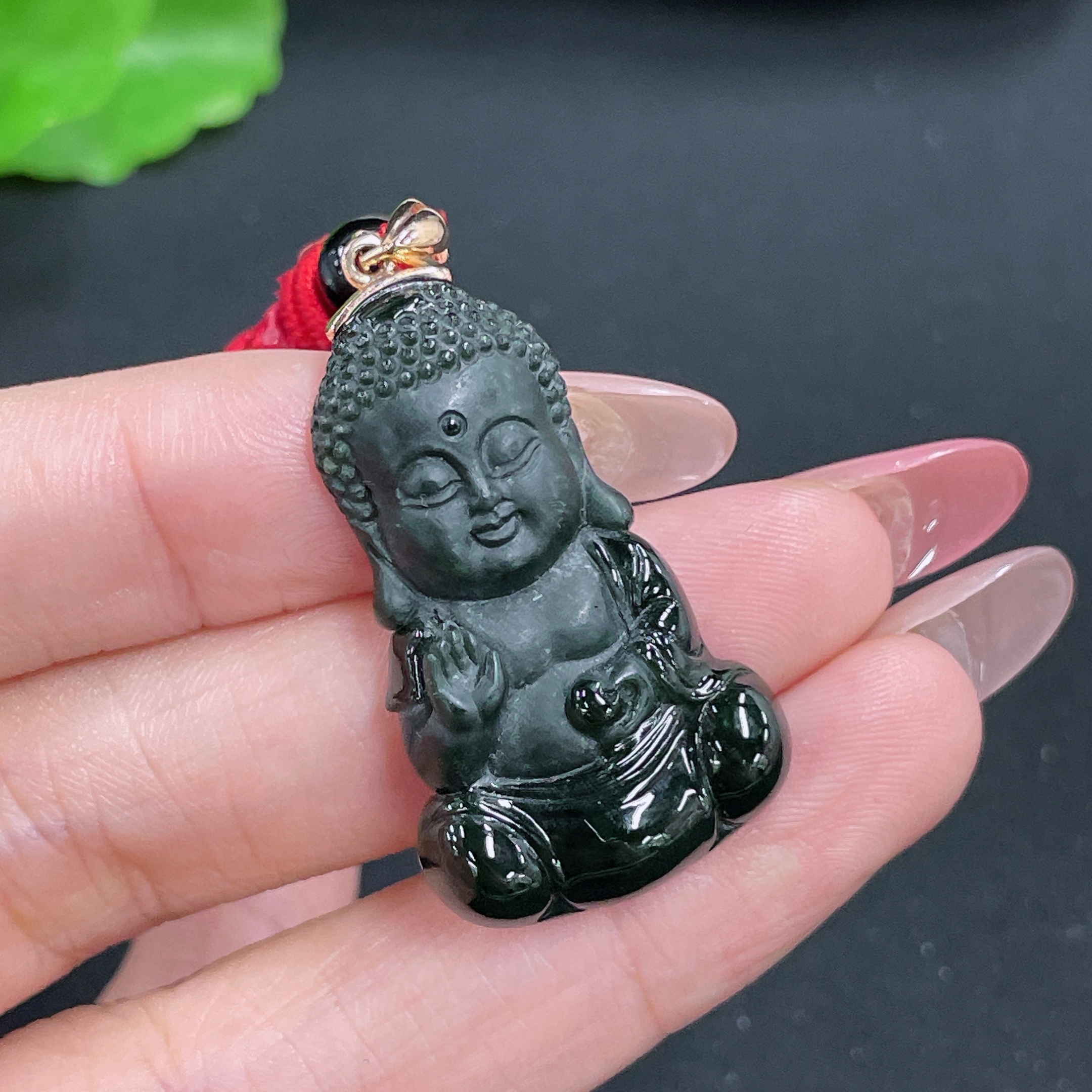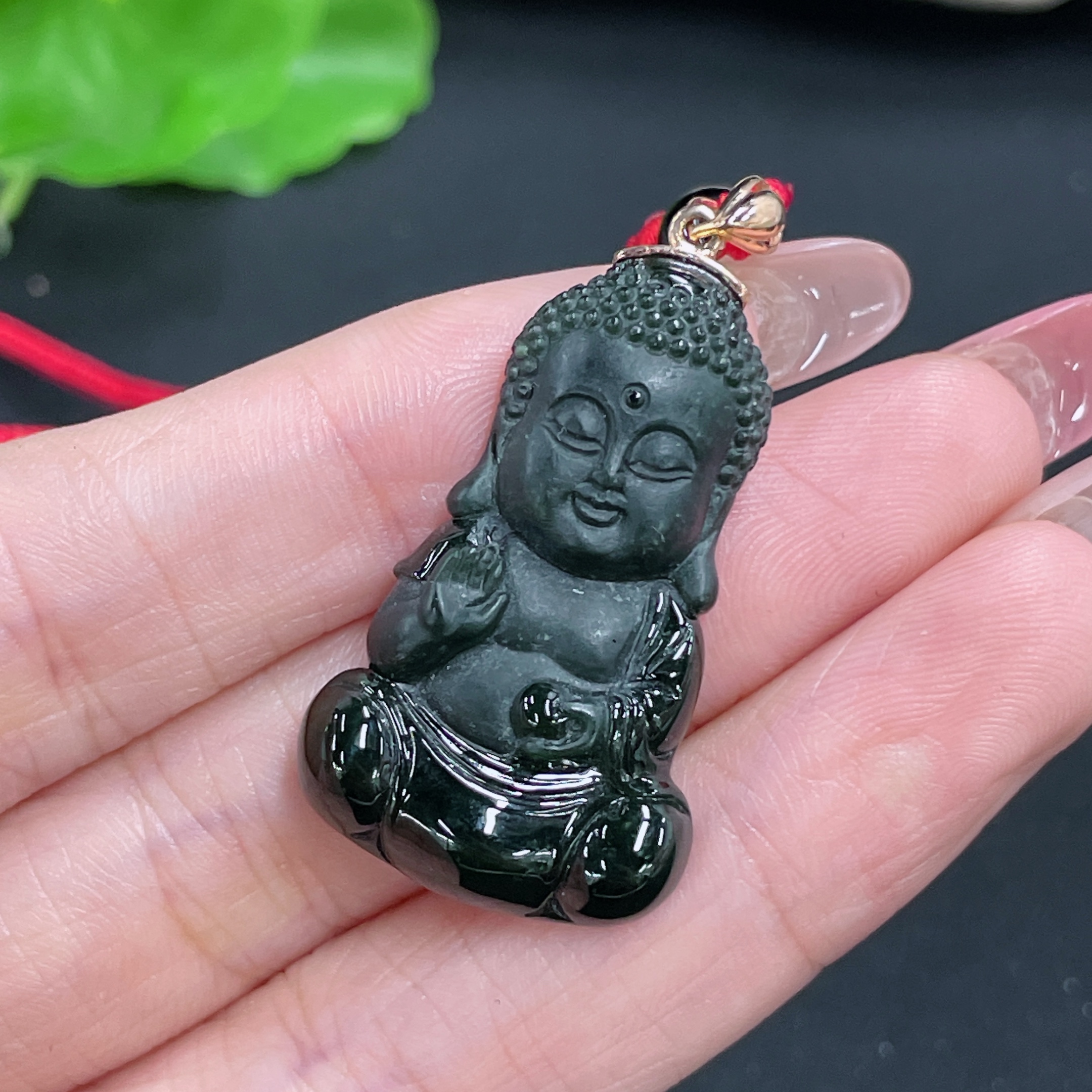 Jadeite Pendant Baby Buddha with 18K Clasp and Rope, Total Weight Approx. 9.86g