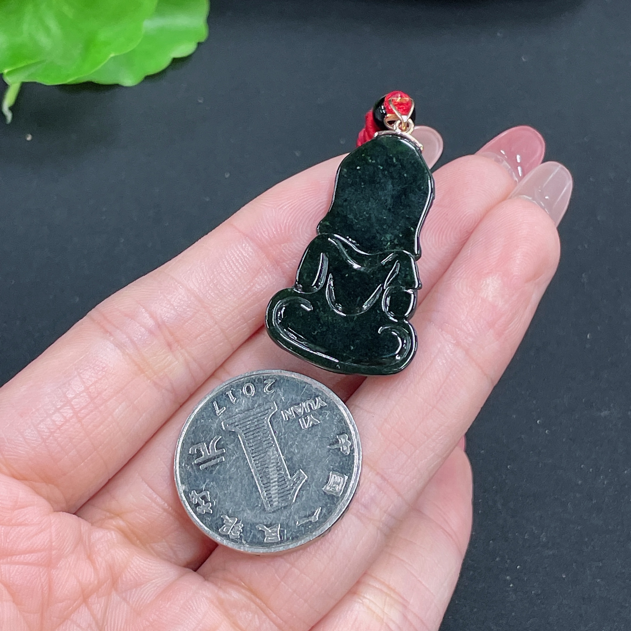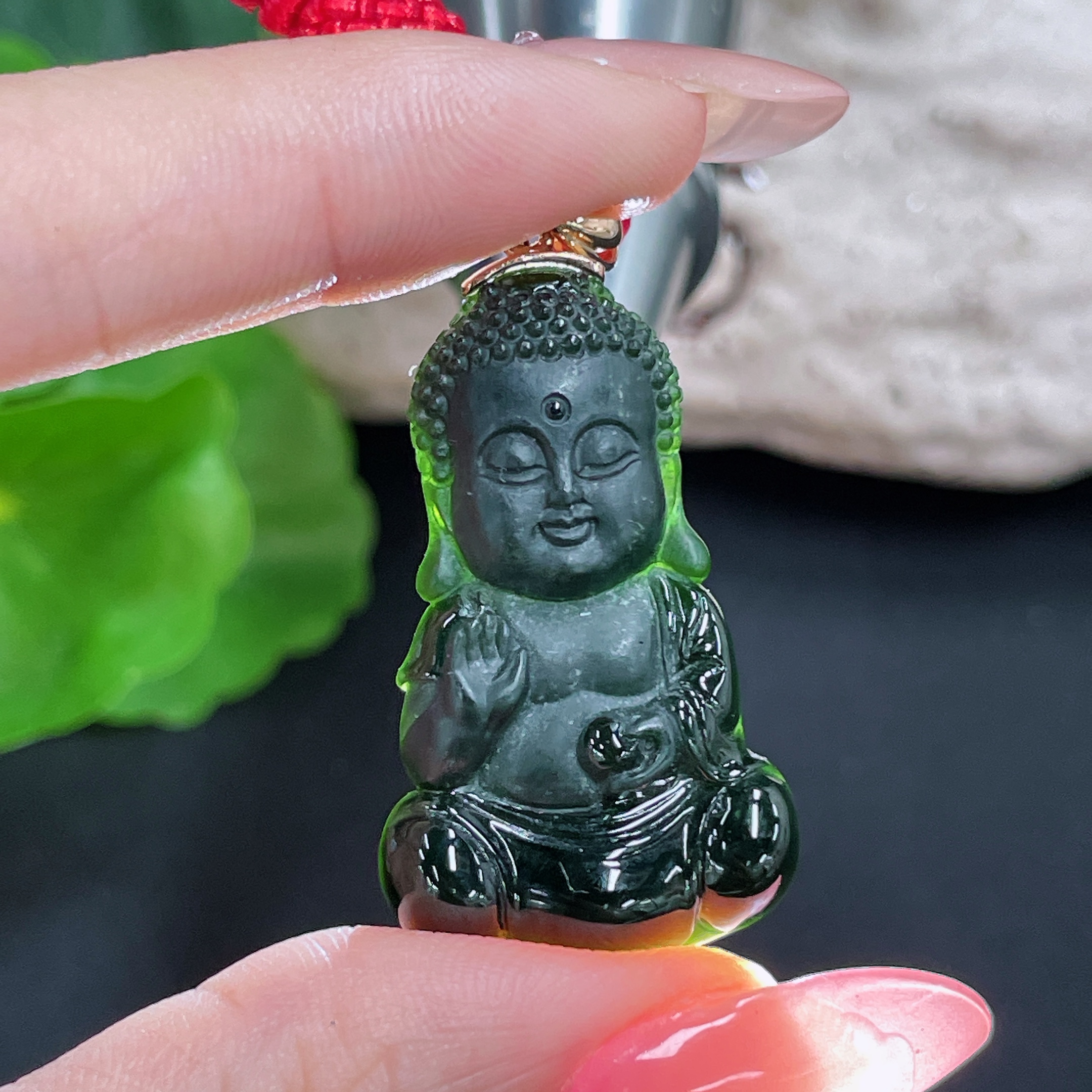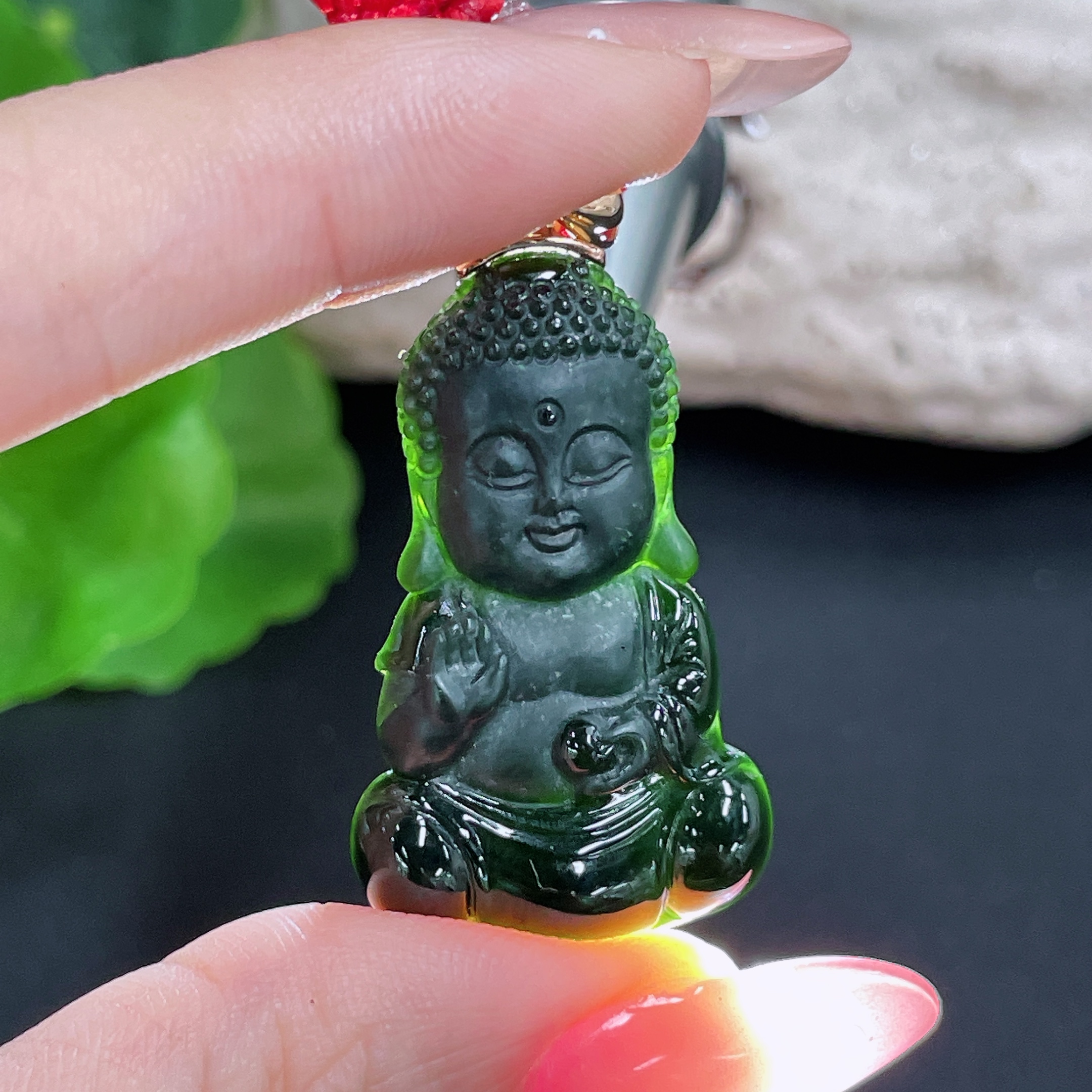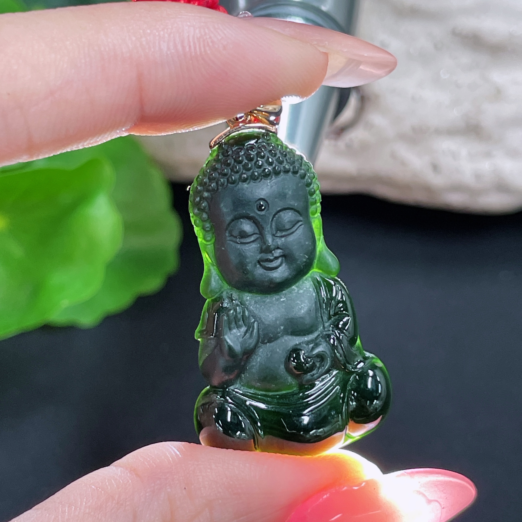 Jadeite Pendant Baby Buddha with 18K Clasp and Rope, Total Weight Approx. 9.86g